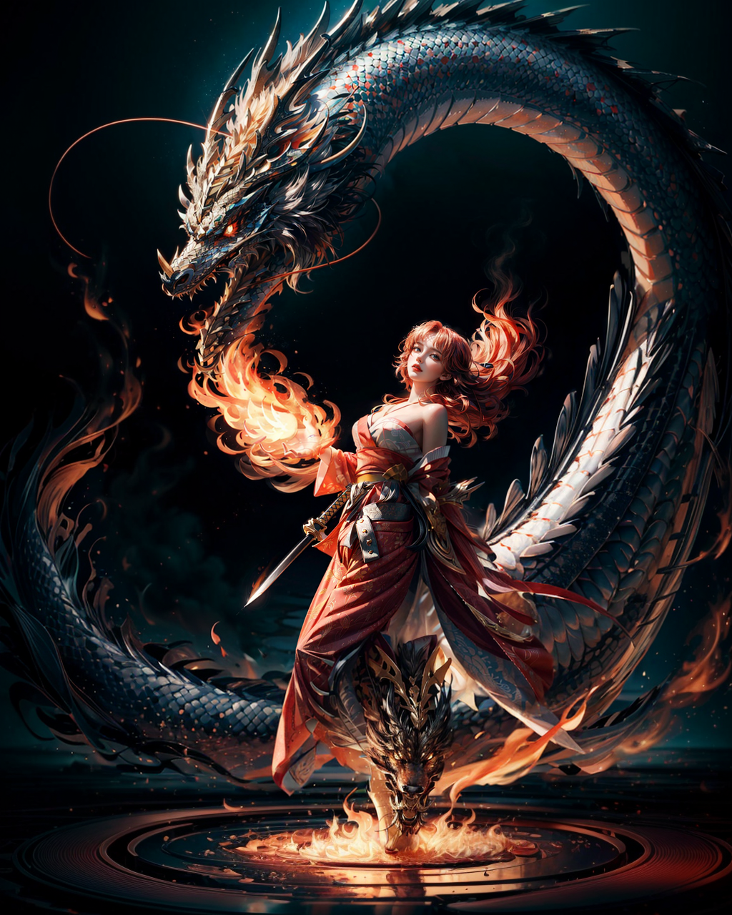 ((cinematic light)), colorful, hyper detail, dramatic light, intricate details, best quality, (extremely detailed CG unity 8k wallpaper, masterpiece, best quality, ultra-detailed, best shadow), (detailed background:1.4), (beautiful detailed face, beautiful detailed eyes), High contrast, (best illumination, an extremely delicate and beautiful), epic realistic, dynamic pose, dynamic angle, 1girl, floating red hair, long hair, (fire:0.7), loong, dragon in the fire, fire dragon, fire around body, flying, flame, flying fire, holding_katana, red katana, red yukata with pattern, ultra detailed, (textured_clothing), black_background, <lora:add_detail:1>, <lora:loong2-000015:0.45>, <lora:fashigirl-v5.4-lora-64dim-naivae-5ep:0.2>, <lora:PerfectNwsjMajic_4:0.4>