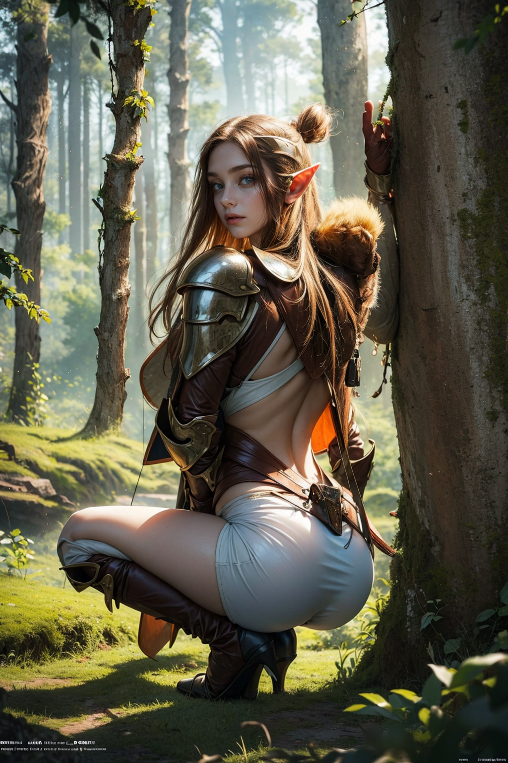 1girl, (ranger:1.4), young elf, leather armor, ((solo)), background outdoors forest elven city, official art, unity 8k wallpaper, ultra detailed, beautiful and aesthetic, masterpiece,best quality, glowing skin, the most beautiful form of chaos, elegant, a brutalist designed, vivid colours, romanticism, <lyco:NonHentaiElf_v10:0.8> <lyco:OF_Sarah_Small:1.0>