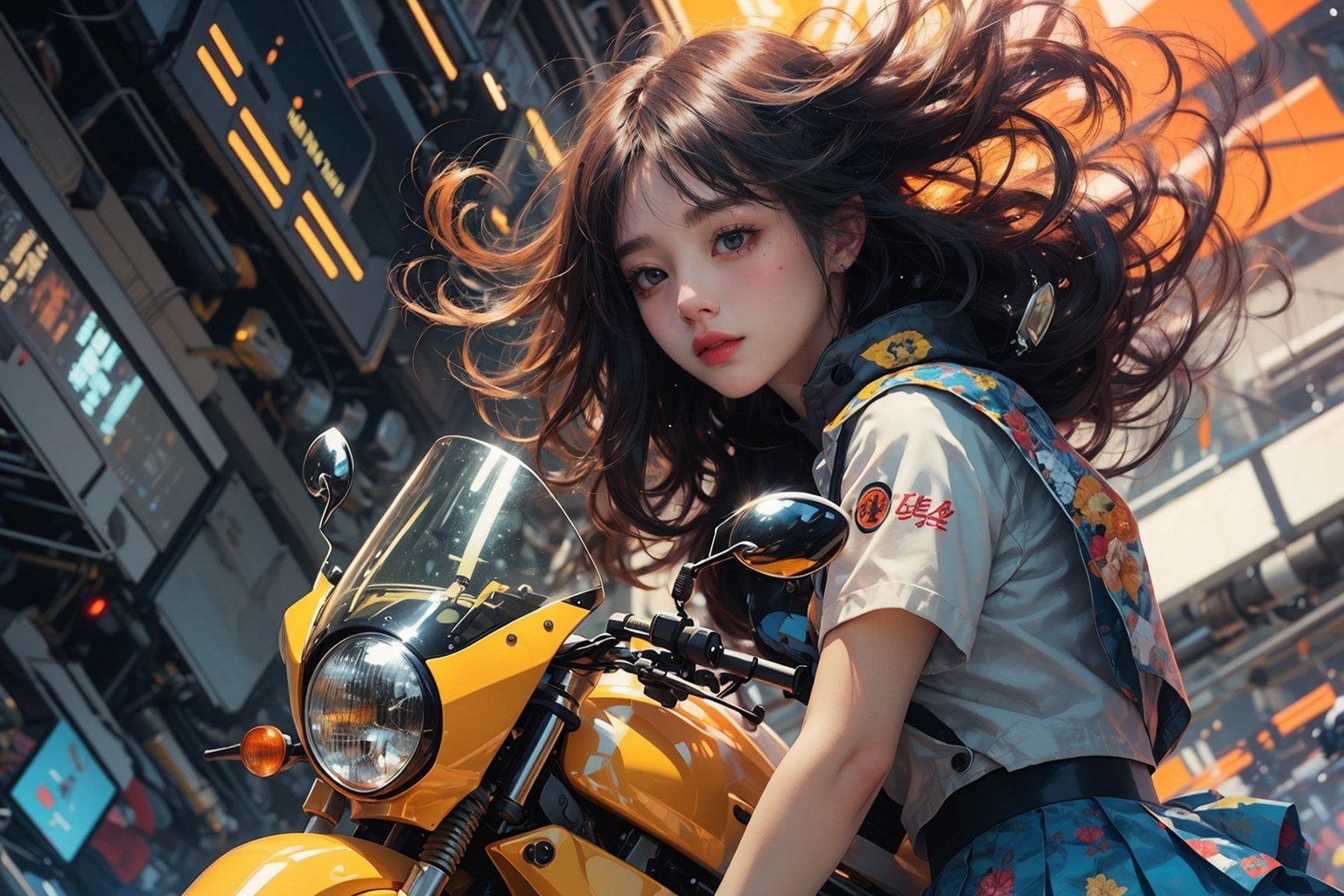 school girl 16 yo, pleated skirt, looking at viewer, from front view, ((yellow motorcycle)), japan cyberpunk background, (dramatic angle, dynamic pose), <lyco:GPTS5 Heavy_387306:0.8>