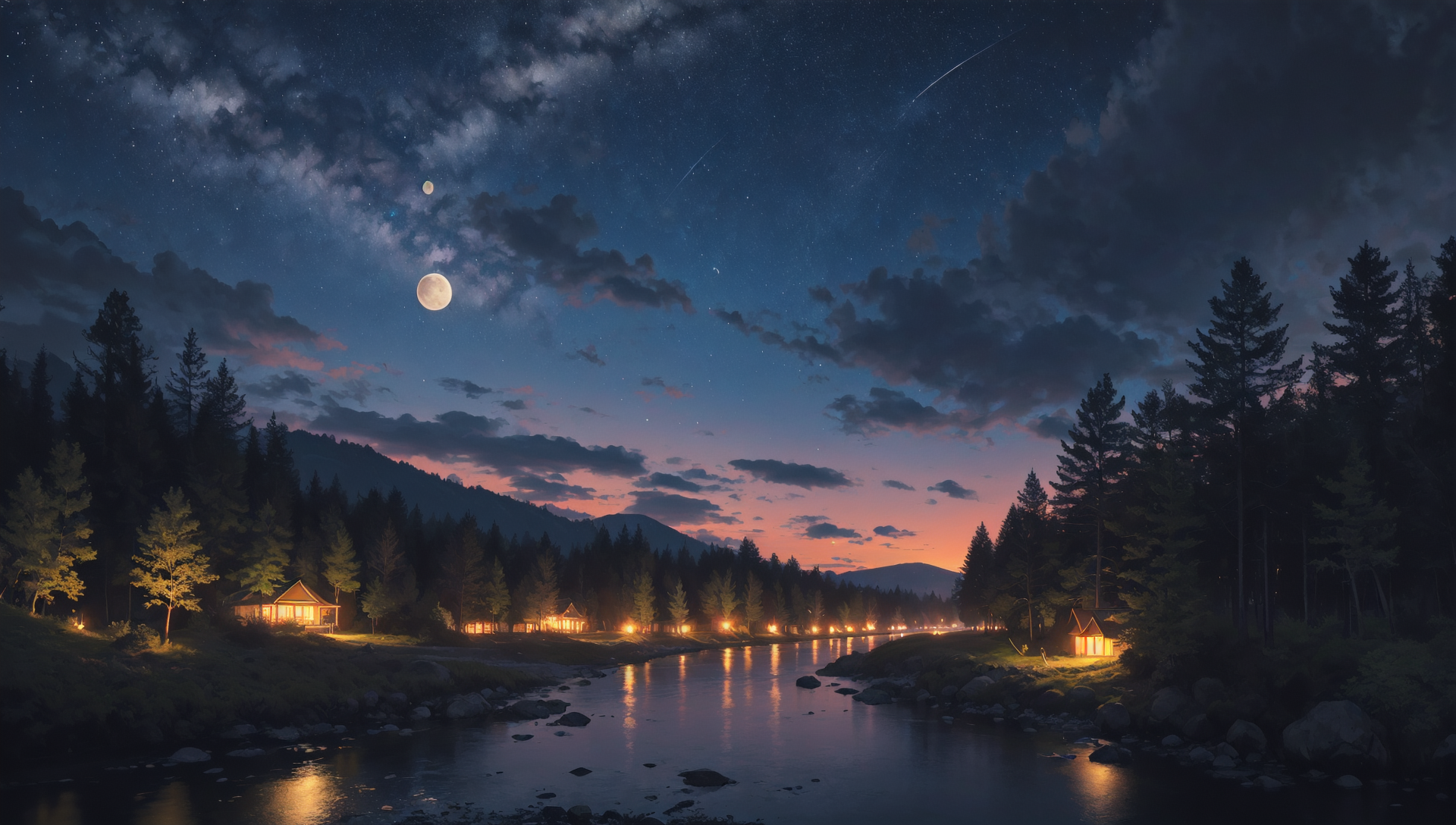 ((masterpiece:1.4,best quality)), ultra detail, cloud, outdoors, red, abundant, 8k, high detail, wallpaper, night, moon, stars, forest, waterfall, river, sparkle
