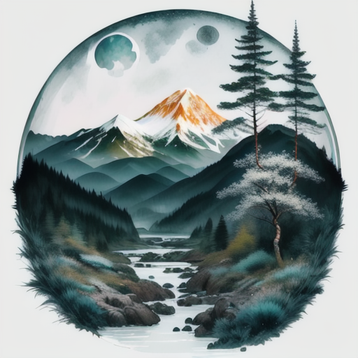 icy mountain top left, green forest, moon top right, stars, forest , white background, scenery, ink, mountains, water, trees,(phcrystal:1.2) <lora:Ink scenery><lora:crystal_v1>