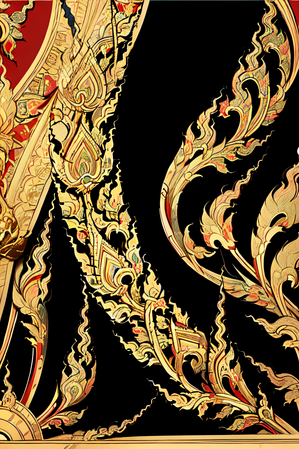 (best quality:1.2),linevichit designs,intricate pattern detailed,((linevichit pattern)),((linekanok background)),(red and black theme),linekanok background paint,a gold and black circular design with swirls <lora:linevichit3-000006:1.25>