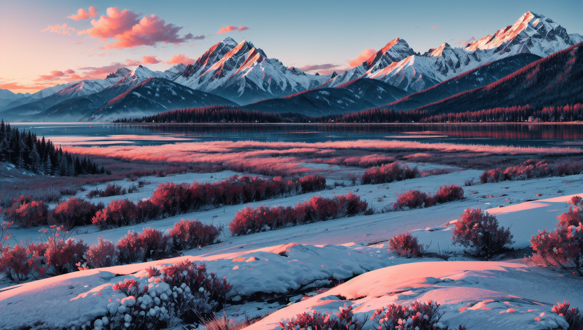 ((masterpiece:1.4,best quality)), cloud, outdoors (mountains), spring glade, scenery, sky, winter, (early morning:1.4),morning red, high detail, abundant, 8k, high detail, wallpaper, <lora:more_details:1.5>, <lora:geometric_shapes:1>
