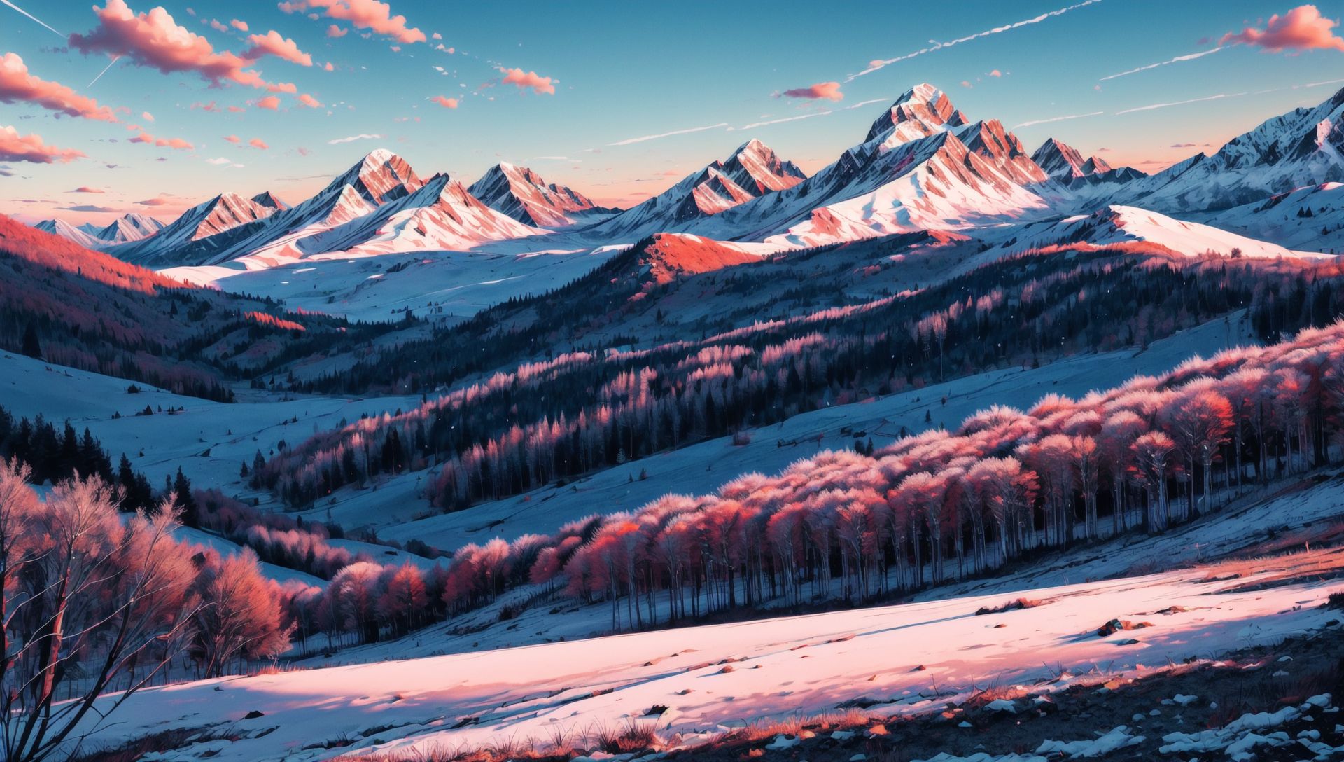 ((masterpiece:1.4,best quality)), cloud, outdoors (mountains), spring glade, scenery, sky, winter, (early morning:1.4),morning red, high detail, abundant, 8k, high detail, wallpaper, <lora:more_details:1.5>, <lora:geometric_shapes:1>