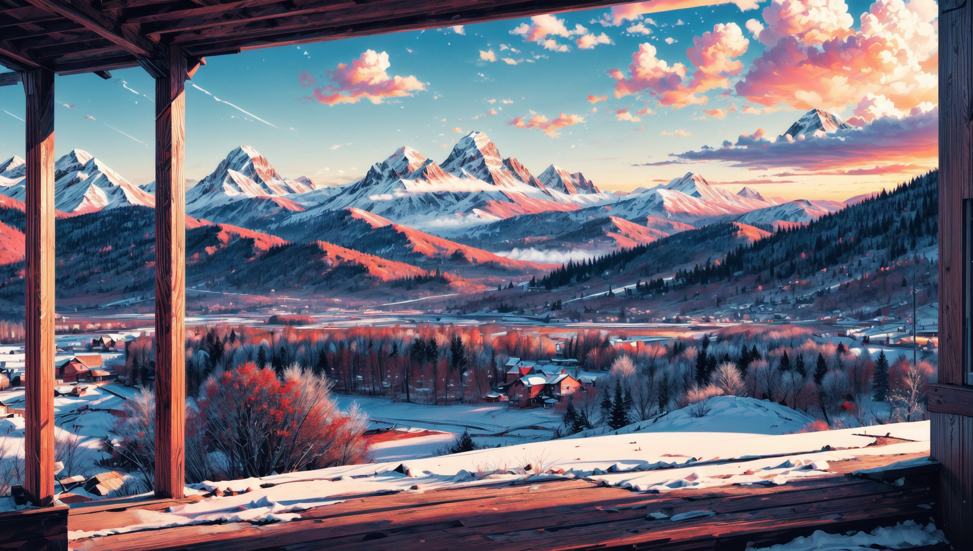 ((masterpiece:1.4,best quality)), cloud, outdoors (mountains), spring glade, scenery, sky, winter, (early morning:1.4),morning red, high detail, abundant, 8k, high detail, wallpaper, <lora:more_details:1.5>, <lora:geometric_shapes:1>