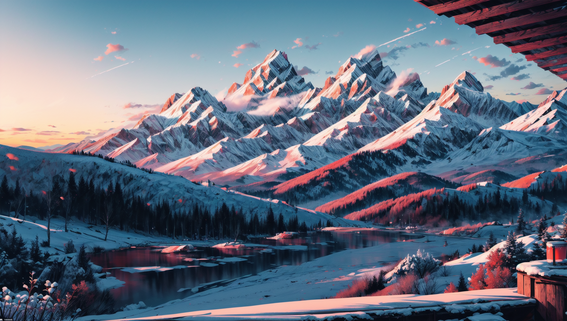((masterpiece:1.4,best quality)), cloud, outdoors (mountains), spring glade, scenery, sky, winter, (early morning:1.4),morning red, high detail, abundant, 8k, high detail, wallpaper, <lora:more_details:1.5>, <lora:geometric_shapes:1>