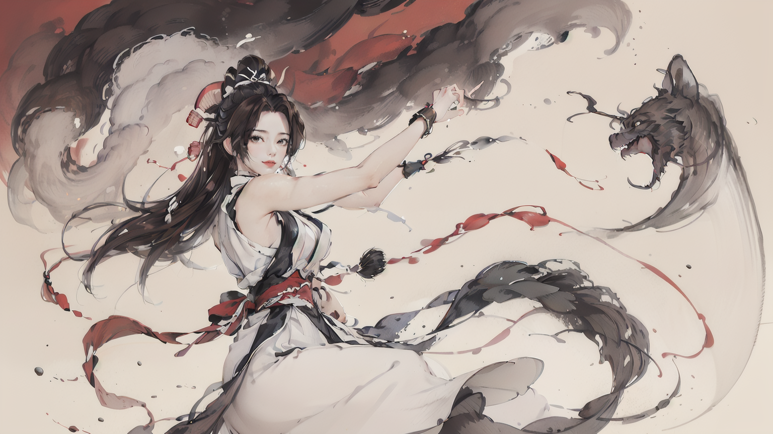 <lora:mai shiranui:0.6>, (Chinese fan:1.2),(mai shiranui:1.2), mai shiranui red dress, King of fighter 98, Amazing, finely detailed, light smile, extremely detailed CG unity 8k wallpaper, ultra-detailed, high res, absurd res, soft light, rim light, vibrant details, depth of field, dramatic action, camera from below, inkbrush,((POMO_BG)) ,hanfu, 80% full body,1girl, solo, dynamic pose, dress flip, Floating dress, Speckled Ink Painting, Ink dot, ink splashing, Ink marks, focus on the girl, looking at the viewer, colourful, <lora:mo:0.4> ink splash, <lora:shuV2:0.5> shukezouma, <lora:qianjinghui:0.6>