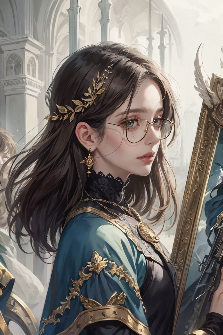best quality, masterpiece, 1 girl, adult (elven:0.7) woman, freckles, yellow eyes, dark brown messy hair, portrait, looking at viewer, solo, 15%from side, side view, (full body:0.6), detailed background, detailed face, (<lora:OrkStyleAISD15:0.6>, OrkstyleAI theme:1.1) medieval alchemist, curious,,wise goggles, ancient amulet,gunpowder,,alchemical implements cluttered, mystical ethereal aura, technology, workshop in background, magical fantasy atmosphere, ethereal ambience,