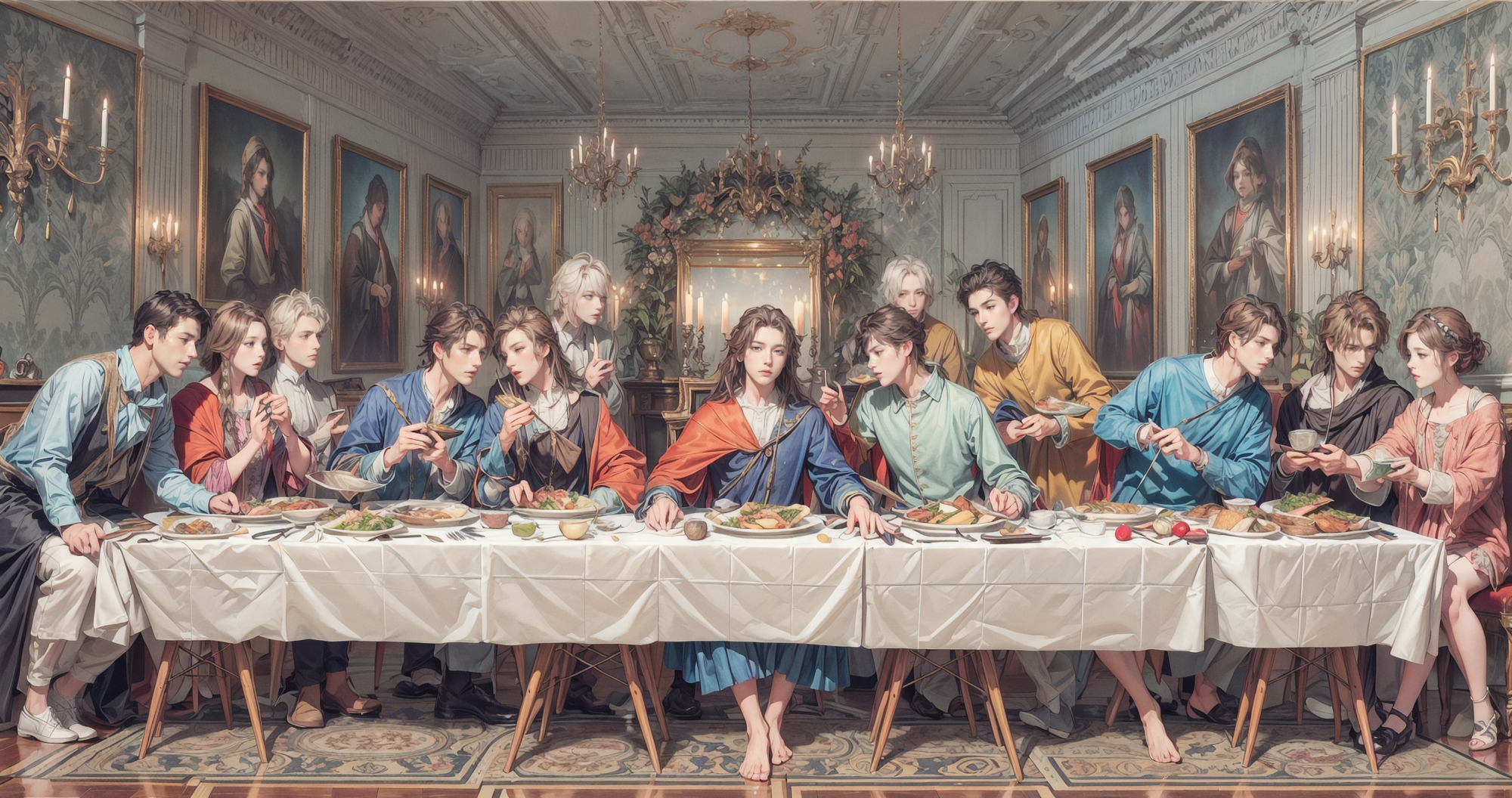 (masterpiece, official art, beautiful and aesthetic),(best quality:1.2,fine art parody, multiple boys,(13 boys:1.2), table, parody, card, multiple girls, board game, brown hair, in a dinning room,detailed face, <lora:bgv2:0.2> <lora:animetarotV51:0.3>,(masterpiece, official art, beautiful and aesthetic),(best quality:1.2),light on face,cinematic lighting,Depth of field, classical,elegant, <lora:add_detail:1>,(having dinner:1.2)