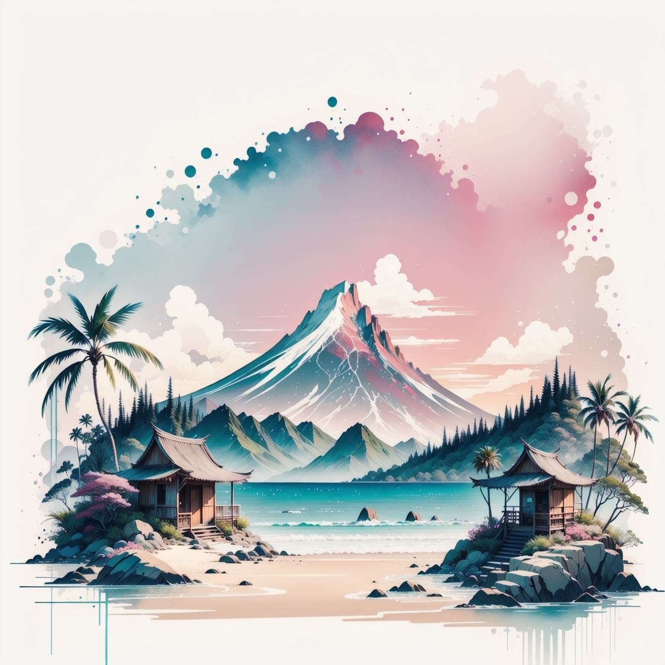 Tropical Island, Beach, moon top right, stars, Camp fire, pink clouds, white background, scenery, ink, ocean, water, palm trees, watercolor, <lora:ink-0.1-3-b28-bf16-D128-A1-1-ep64-768-DAdaptation-cosine:1>
