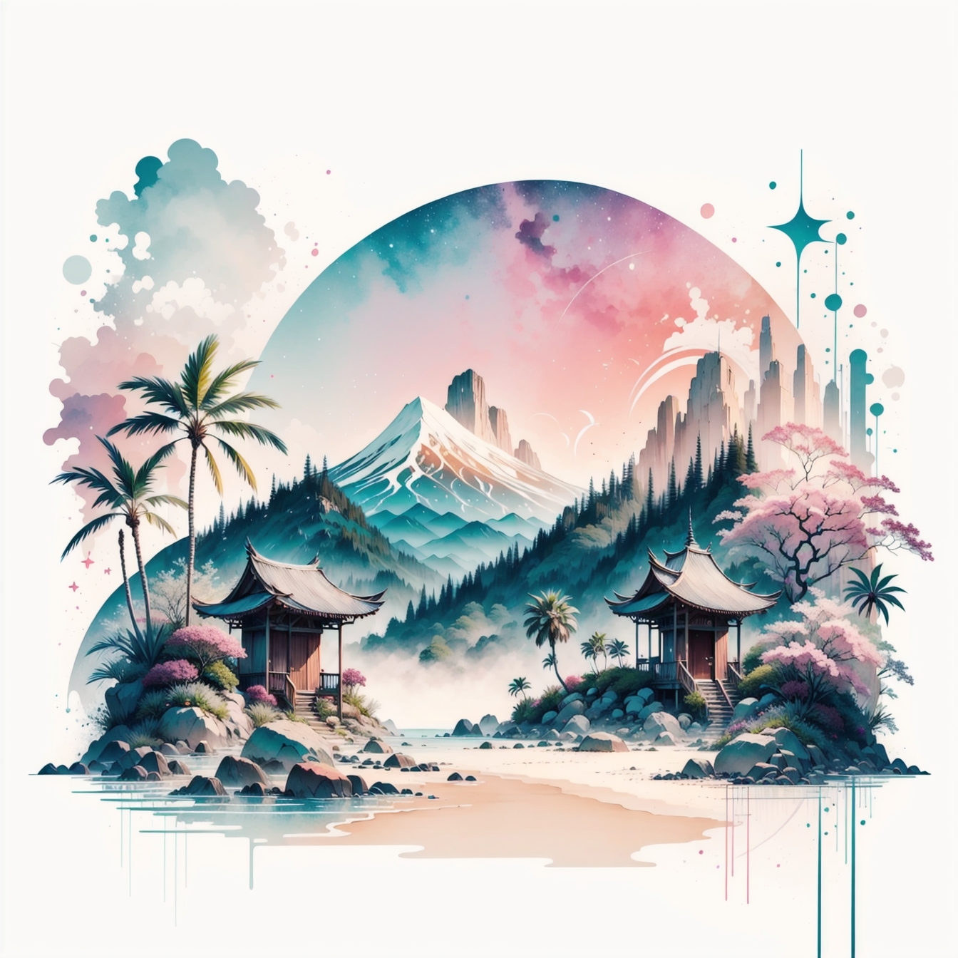 Tropical Island, Beach, moon top right, stars, Camp fire, pink clouds, white background, scenery, ink, ocean, water, palm trees, watercolor, <lora:ink-0.1-3-b28-bf16-D128-A1-1-ep64-768-DAdaptation-cosine:1>