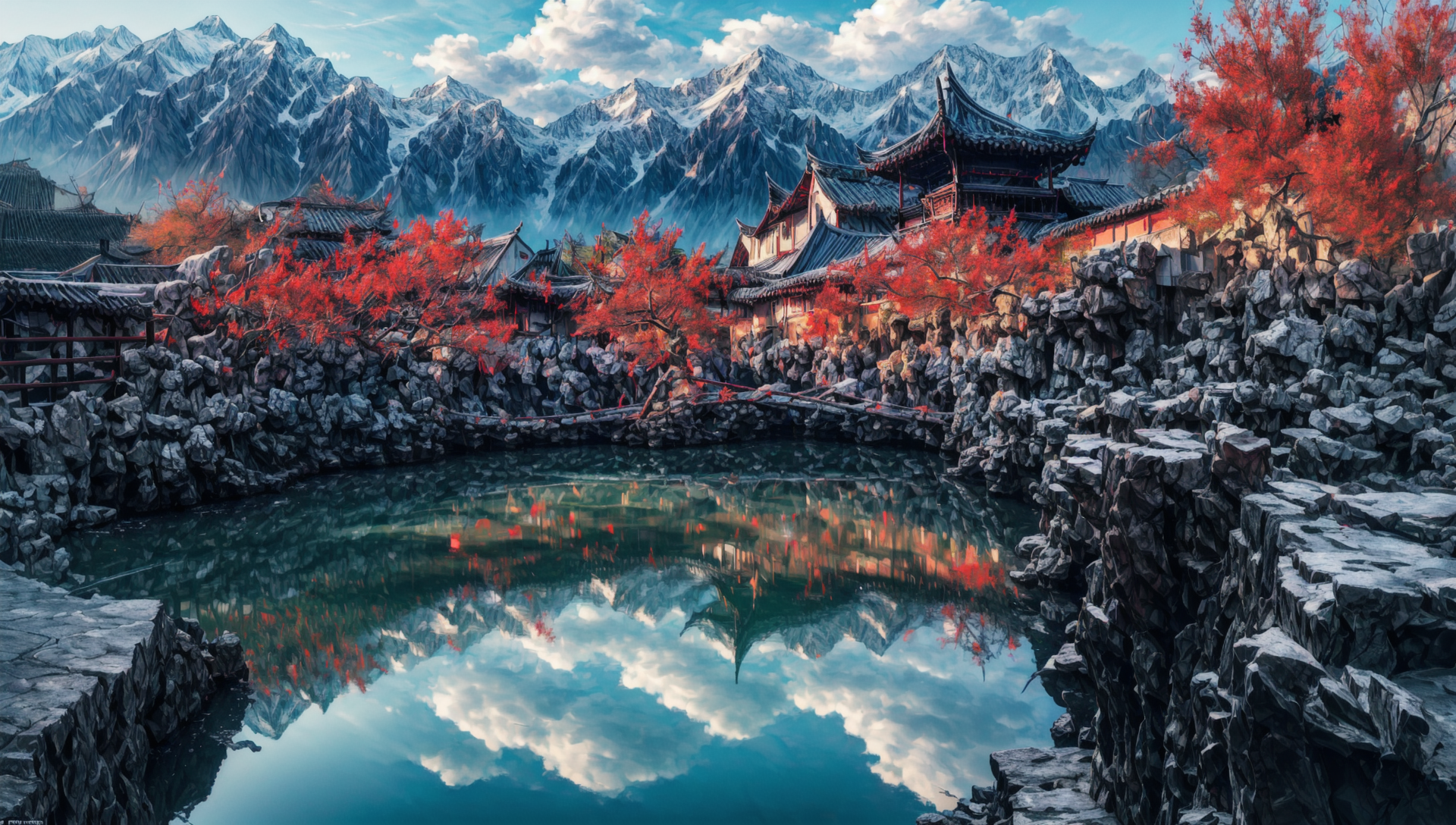 ((masterpiece:1.4,best quality)), cloud, outdoors (mountains), spring glade, scenery, sky, winter, (early morning:1.4),morning red, high detail, abundant, 8k, high detail, wallpaper, <lora:more_details:1.5>, <lora:suzhouyuanlin:1>