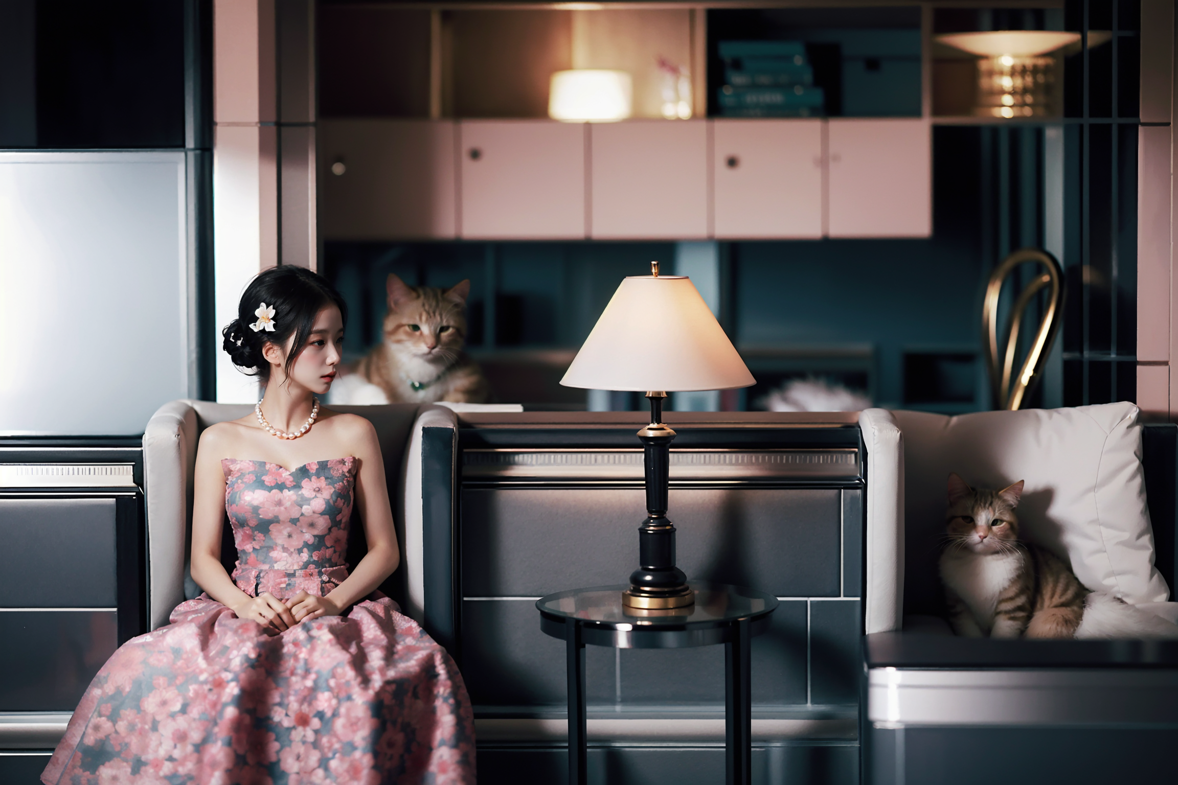 1girl, updo, pearl necklace, black dress with pink flowers pattern, fluffy cat, <lora:makina69_jisoo_v2.3:1>