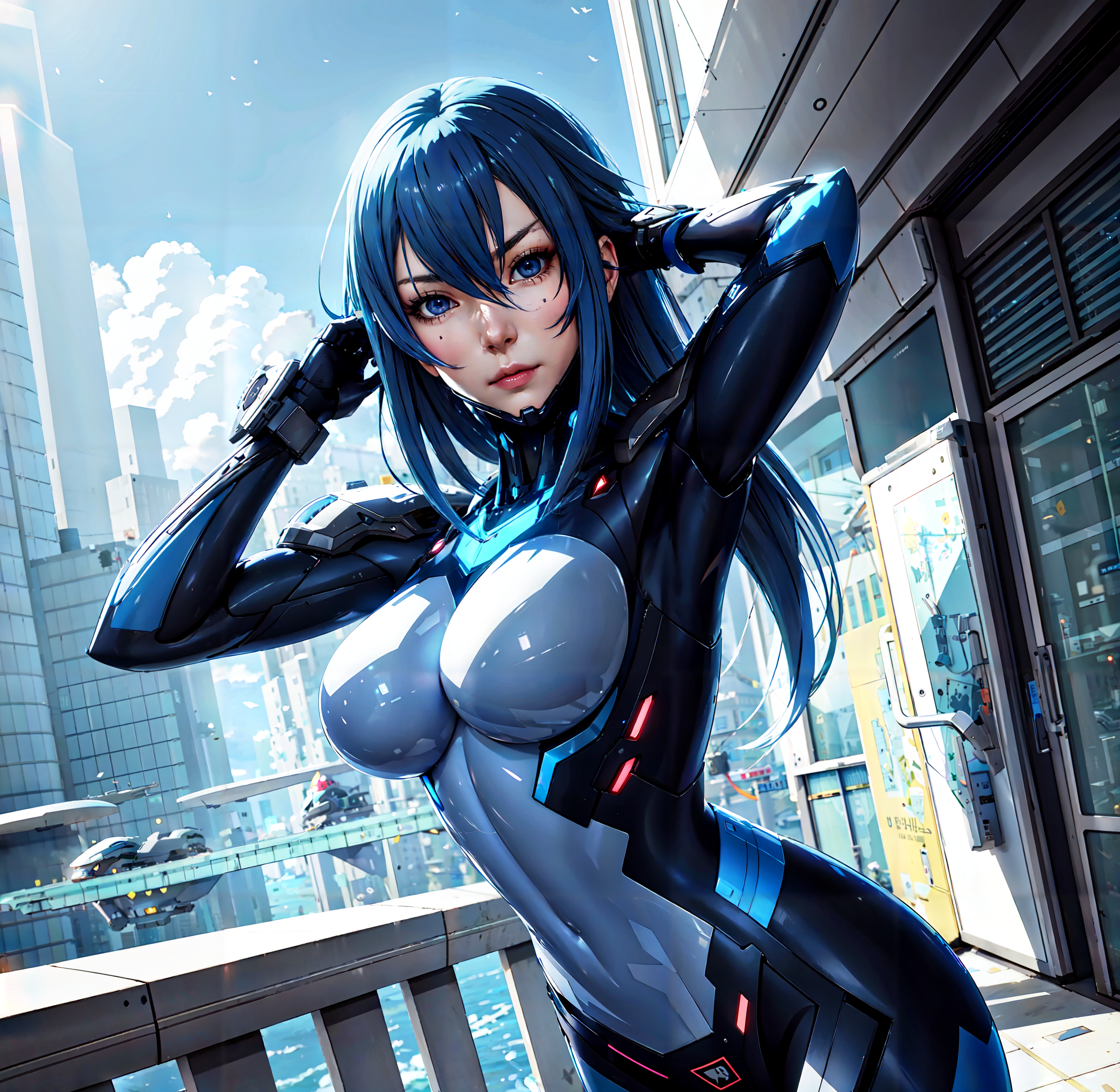 <lora:fortifiedsuit:0.6>, fortified_suit, ((masterpiece,best quality)), 1girl, (breasts,large_breasts:0.6),looking at viewer,anime,Poker face,(glamorous),(beautiful detailed face,beautiful,detailed eyes:0.1),concept art of a far-future city, key visual, summer day, (highly detailed), digital painting, artstation, concept art, sharp focus, in harmony with nature, streamlined, by makoto shinkai and akihiko yoshida and hidari and wlop,dynamic pose, (HQ,4K), blue glowing eyes with frost energry, long hair, blue hair, dark_eyeshadow, black eyeshadow,