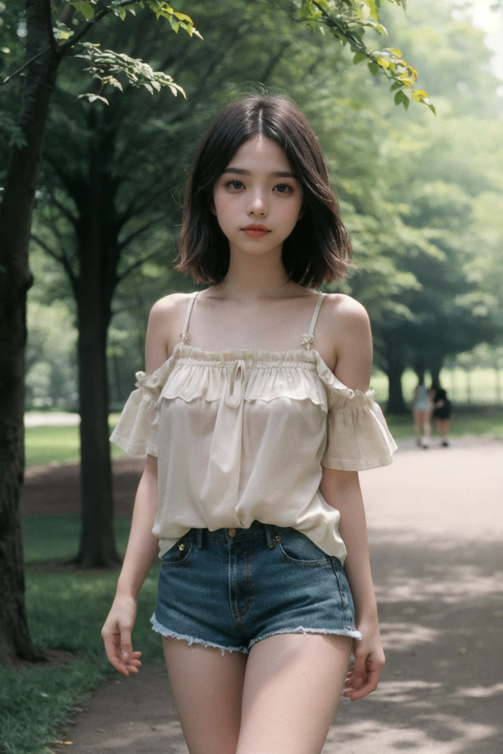 <lora:AiUehara_Jav-02:1>, 1girl, walking (in a park), wearing (cute top), (short shorts), (modern photography), 85mm, (analog, cinematic, film grain:1.3), (looking at viewer:1.2), detailed eyes, natural smooth skin texture, light makeup, epiCPhoto, <lora:add_detail:0.5>