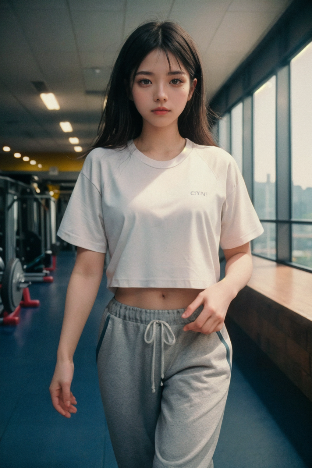 <lora:AiUehara_Jav-02:1>, 1girl, walking (in a gym), wearing (gym shirt, sweatpants), (modern photography), 85mm, (analog, cinematic, film grain:1.3), (looking at viewer:1.2), detailed eyes, natural smooth skin texture, light makeup, epiCPhoto, <lora:add_detail:0.5>