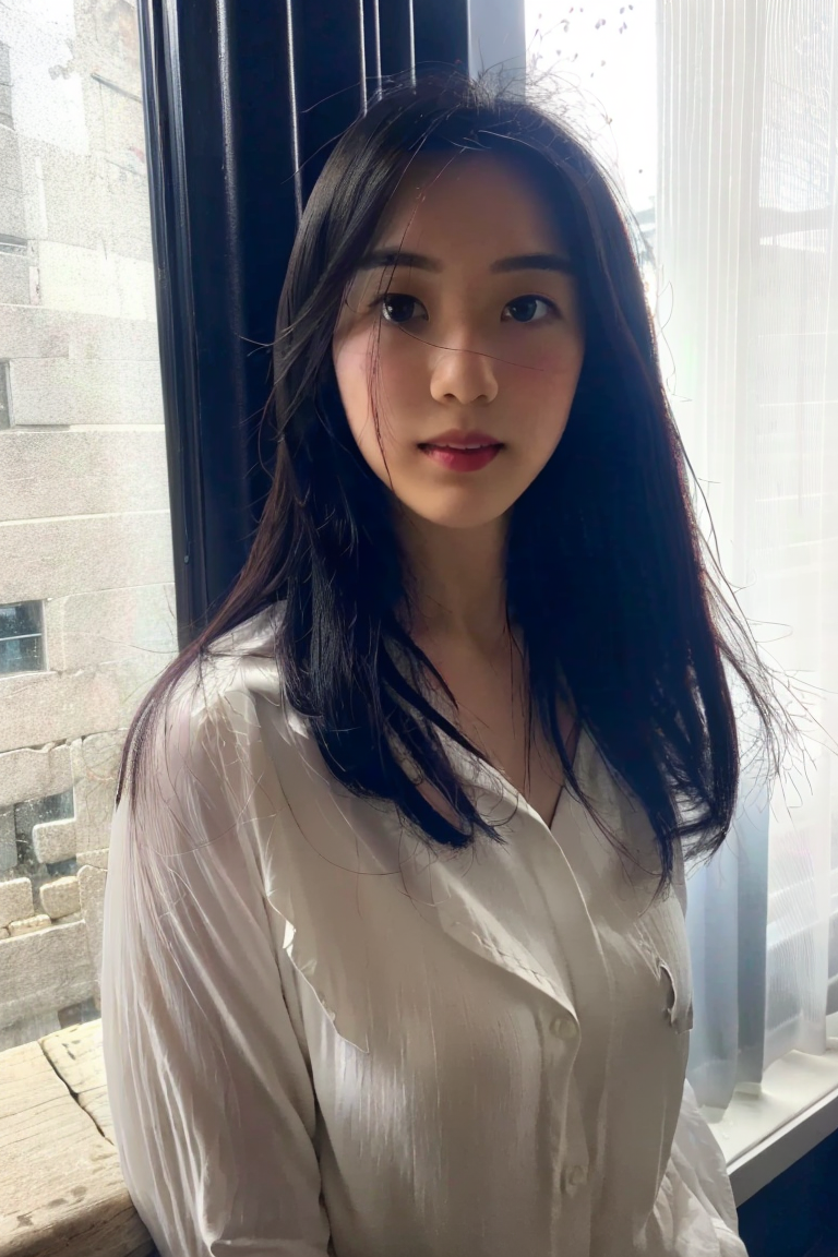 light from left,1girl, looking at viewer, long hair, white shirt, upper body, best quality, masterpiece, sunlight, shining in through the window,shade,strong contrast,large light ratio,sunlight, <lora:yulijun:0.8>