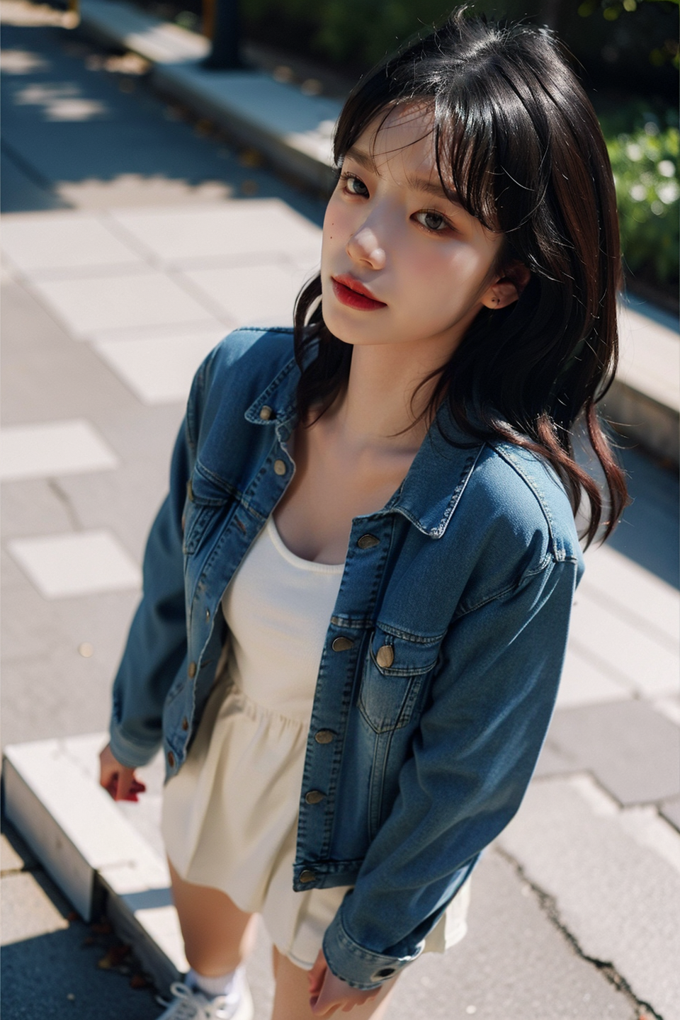 1girl, solo, skinny, pale skin, smooth skin, beauty, light makeup, medium breasts, looking at viewer, standing, camisole dress, denim jacket, white sneakers, (masterpiece:1.2), best quality, ultra high res, raw photo, perfect lighting, soft light, rim light, (realistic, photorealistic:1.4),