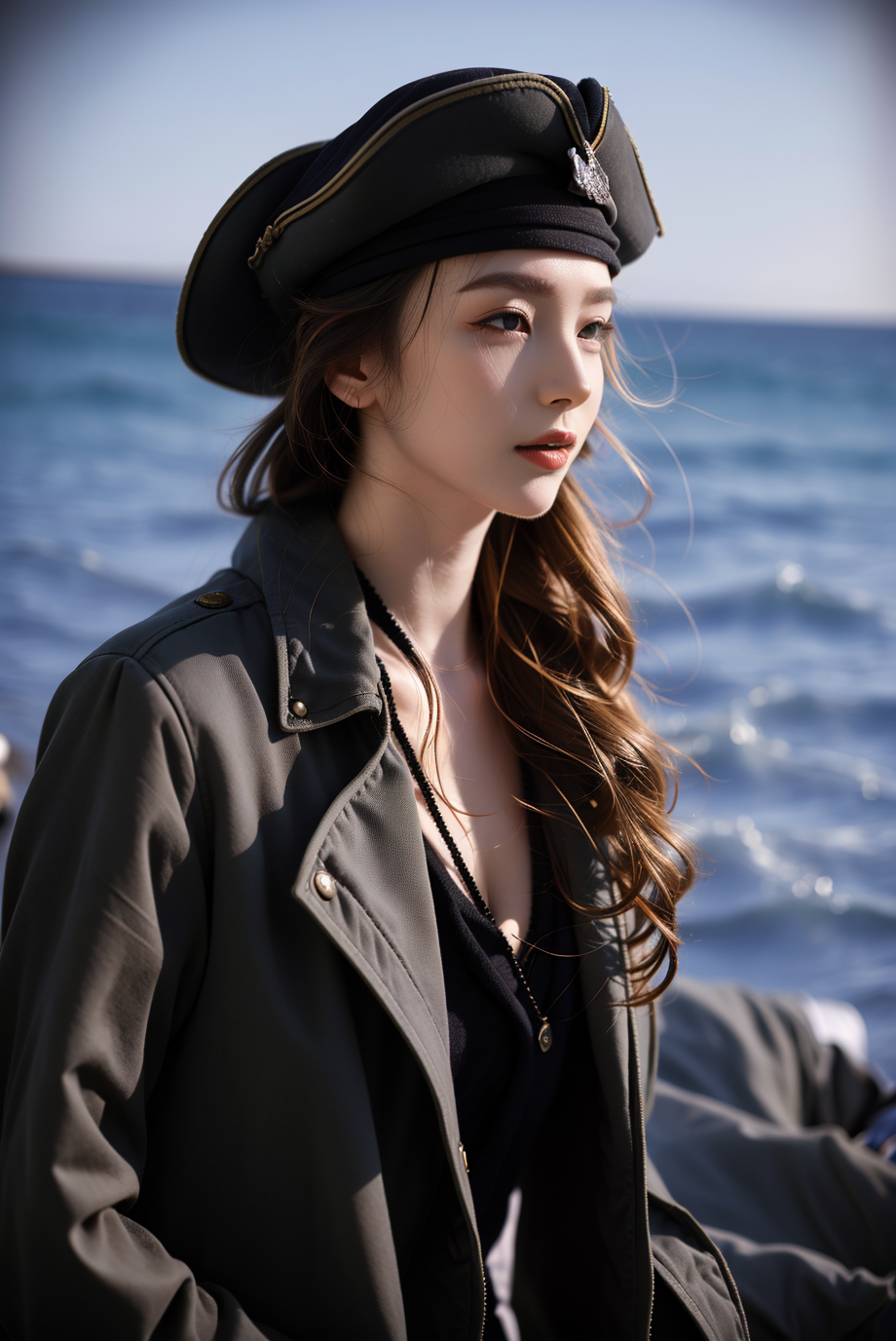 Closeup, A 20 yo woman, dark theme, soothing tones, muted colors, pirate hat, jacket, jeans, fashion, high contrast, (natural skin texture, hyperrealism, soft light, sharp), upper body, sea, ocean, <lora:VickiWade-01:1> <lora:MoosMST4:1>