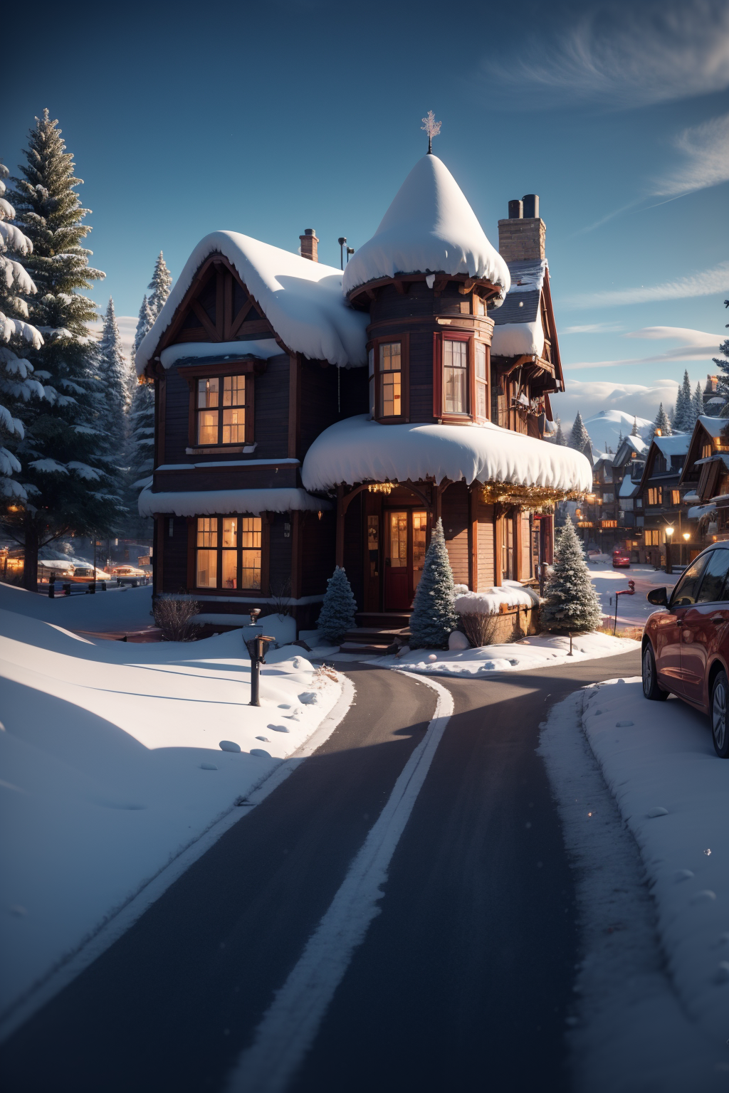 <lora:éªé:0.8>,cs,snow,outdoors,no humans,ground vehicle,scenery,motor vehicle,sky,snowman,car,tree,day,blue sky,winter,blurry,house,building,road,cloud,depth of field,
