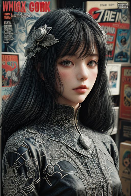 Ceramic dadaism art woman , texture,mixmedia,collage of filigree clothes ,Asymmetric style,ink color style ,Comic book,cartoon,intricate details,sharp focus,3d, high resolution,chans-wong
