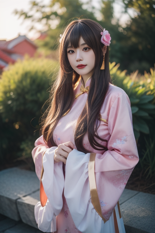ltra-detailed,highly detailed,best quality,masterpiece,illustration,realistic,photorealistic, linxiaomei, wanniang, taiwan \(hetalia\), 1girl, solo, cosplay, chinese clothes, china dress, hanfu, wide sleeves, long sleeves, frilled sleeves, sleeves past wrists, frills, brown hair, very long hair, blunt bangs, hair ornament, hair flower, bun cover, cowboy shot, looking at viewer, outdoors, blurry background, depth of field, nature, sunlight, dusk, flower, grass, cattail, <lora:linxiaomei_v1_04:0.8>
