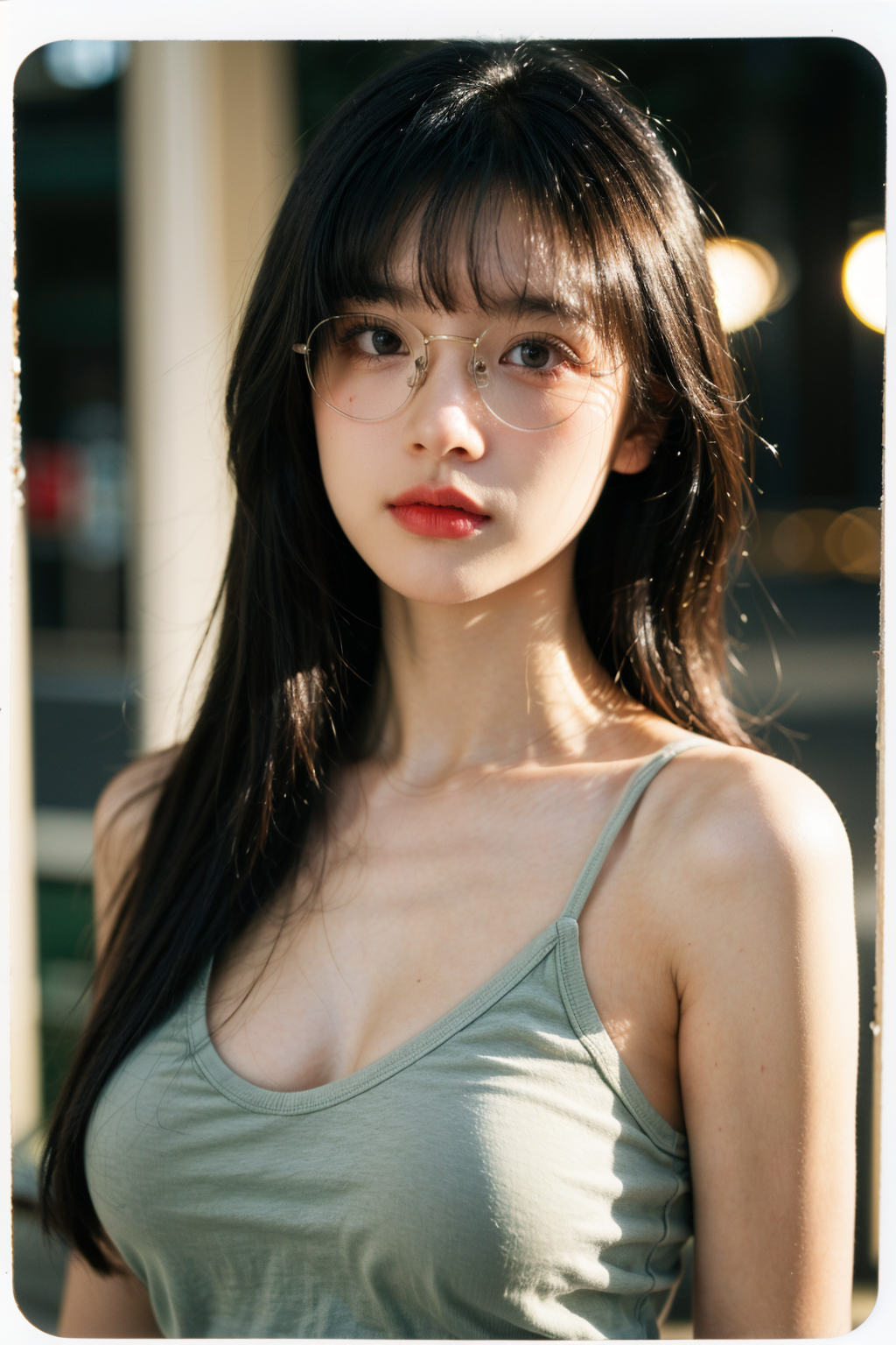portrait, hard candy, playful face, (green eyes:0.5), ((dark scene, soft lighting:1.3)), long hair with bangs, glossy lips, olive green retro bomber jacket, ((polaroid photo)), thick acetate glasses, big tits, cleavage, tank top, open clothes, epiCPhoto