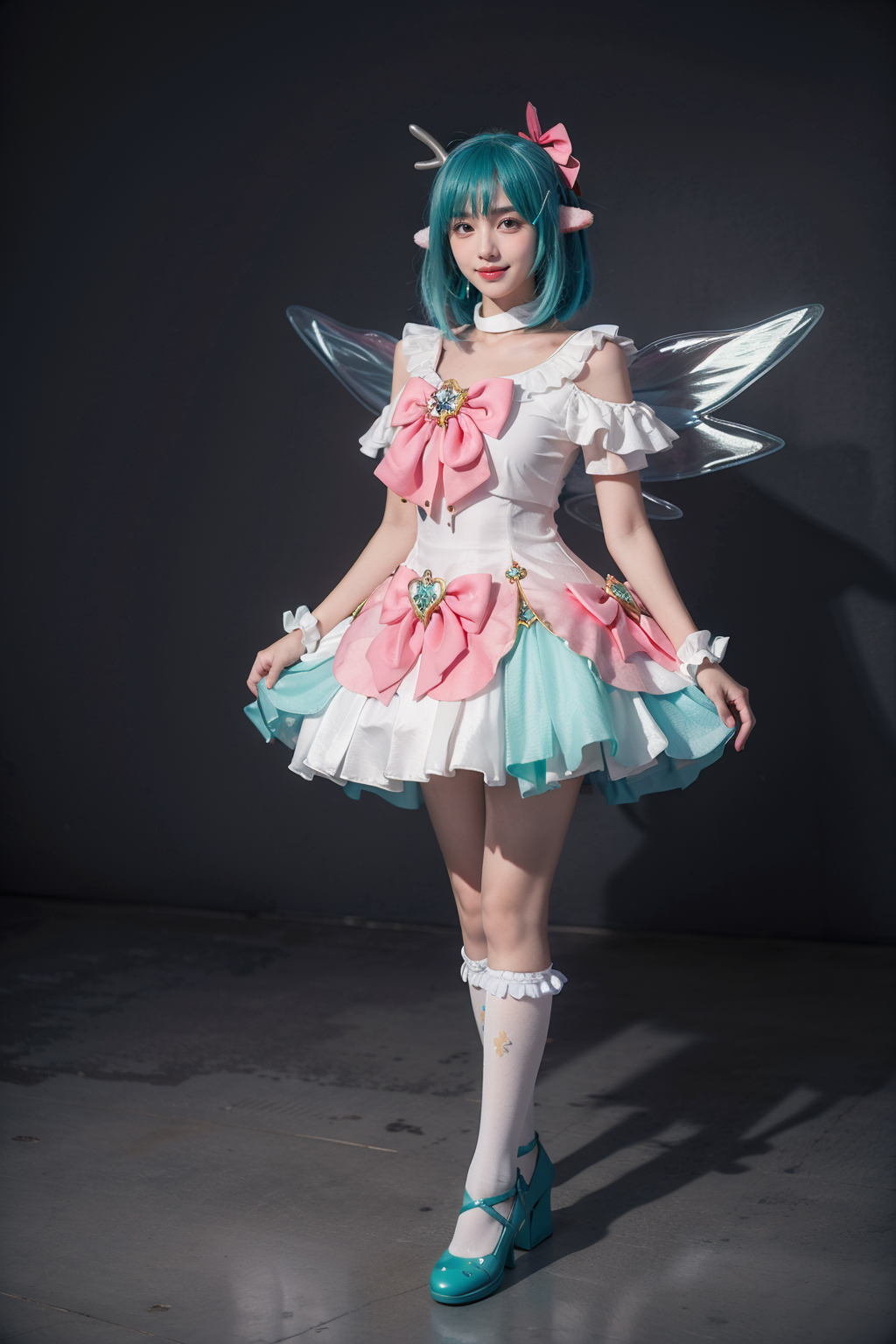 best quality, masterpiece, realistic, photorealistic, 1girl, solo, looking at viewer, smile, standing, full body, yao cosplay costume, aqua hair, dress, shoulder cutout, frills, choker, wrist cuffs, antlers, horns, bow, wings, hair ornament, animal ears, hair bow, hairclip, socks, kneehighs, shoes, high heels, grey background, <lora:King_of_Glory_Yao_ShiZhiQiYuan_cosplay_costume_v1:0.7>