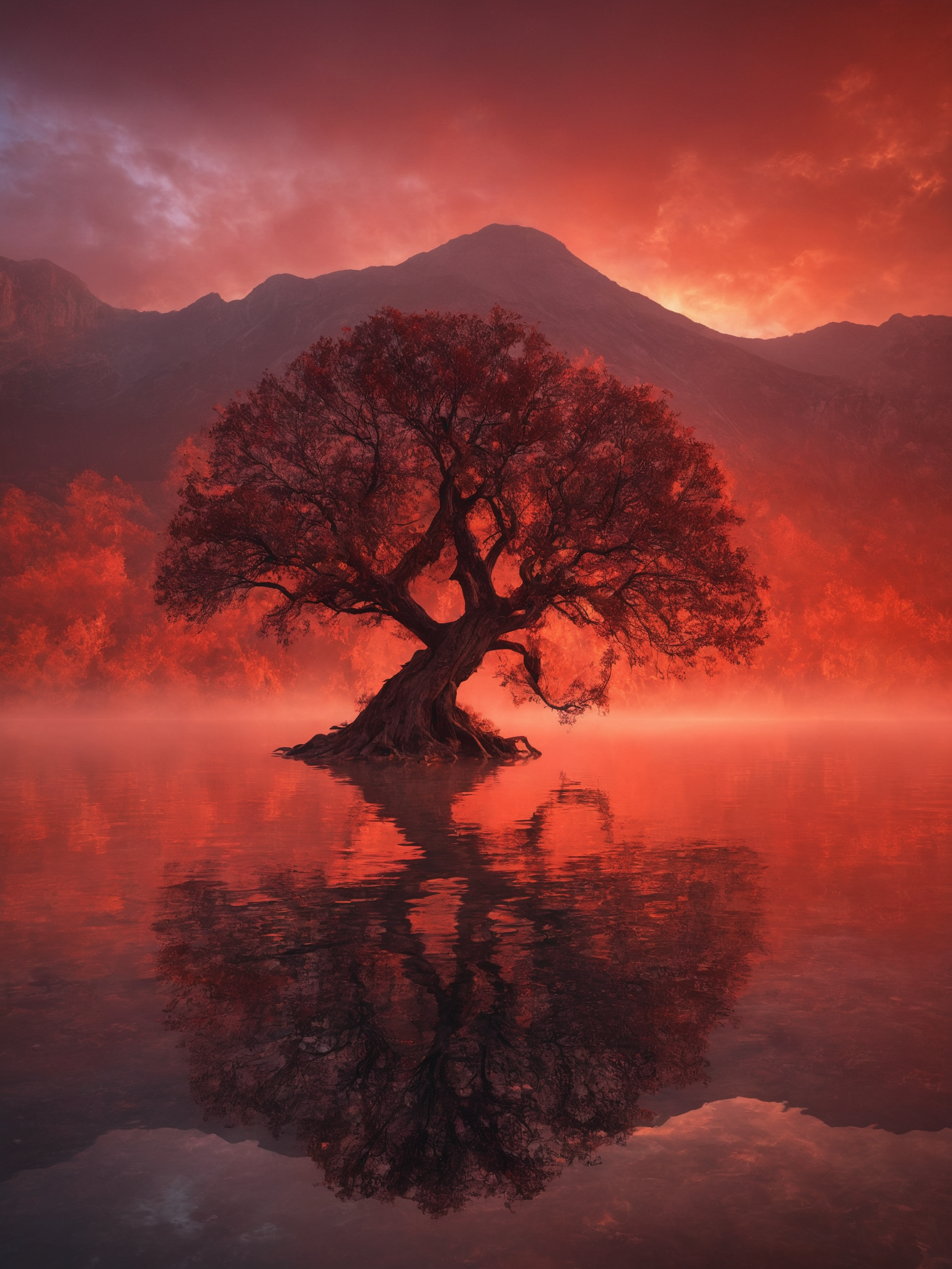 depict a cascaded landscape with low twilight red lights reflected on a beautiful lake surrounded by cascaded mountains. BREAK the tree of life illuminating red colored fumes, grounded in the middle of the lake casting its shadows across the scene. ultra-realistic, mysterious, mystical, high dynamic range, 3 dimensional.