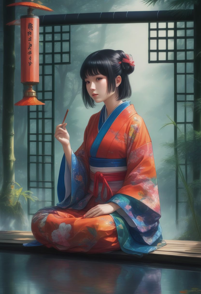 (masterpiece,best quality,high quality, extremely detailed, absurd detail, highres:1.5), colorful, 1girl, a girl in a kimono sitting in a glass bottle in the middle of a bamboo forest in front of a tori gate, tsukihime
