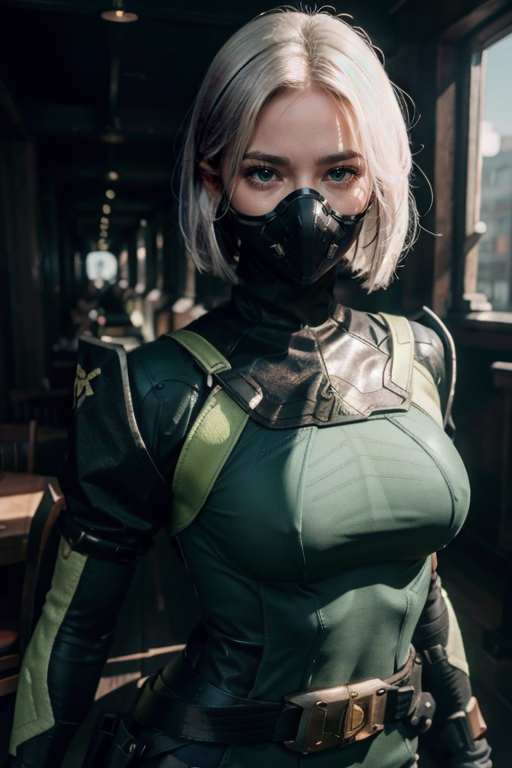 white hair, curly, busty, real, best quality, (cinematic light), (detailed face, detail skin texture, ultra-detailed body), <lora:viper-nvwls-ver2-final:0.9> valorantViper, green eyes, red bodysuit, gloves, belt, thigh boots, respirator,