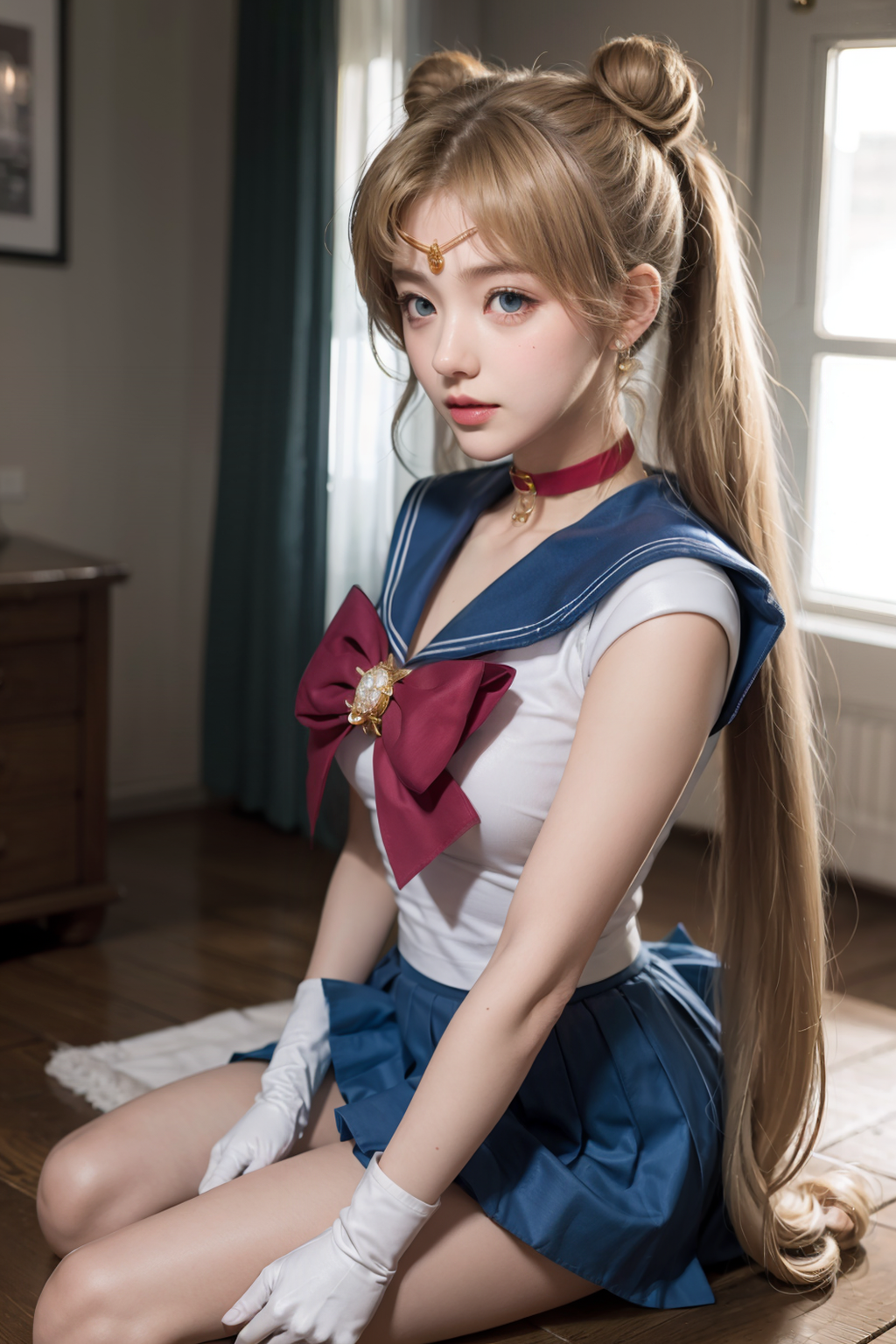 masterpiece, best quality, <lora:smoon-2:1>,sailor moon,1girl, long hair,jewelry, sailor senshi uniform, blue sailor collar,blonde hair, red choker,white gloves, twintails, red bow, blue skirt, blue eyes, hair bun,