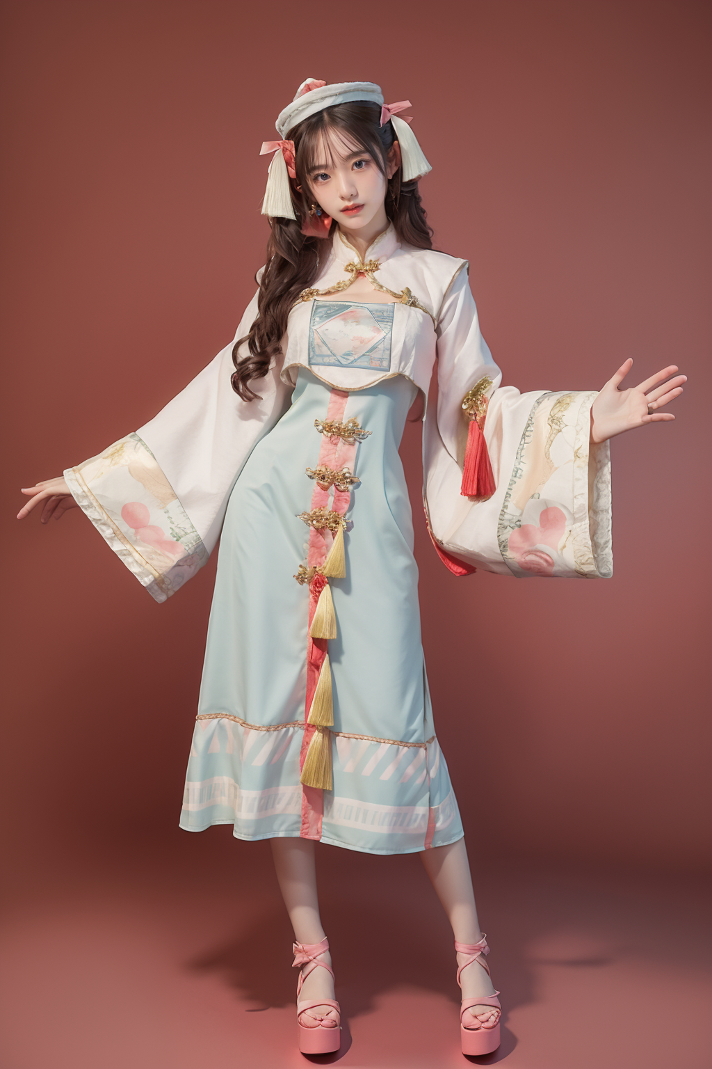 solo,red background,1Girl,standing,,ruanyi0474,dress,bow,chinese clothes,hat,platform footwear,see-through,wide sleeves,tassel,<lora:0474 Zombie little loli_v1:1>, best quality,masterpiece,highres,official art,extremely detailed cg unity 8k wallpaper