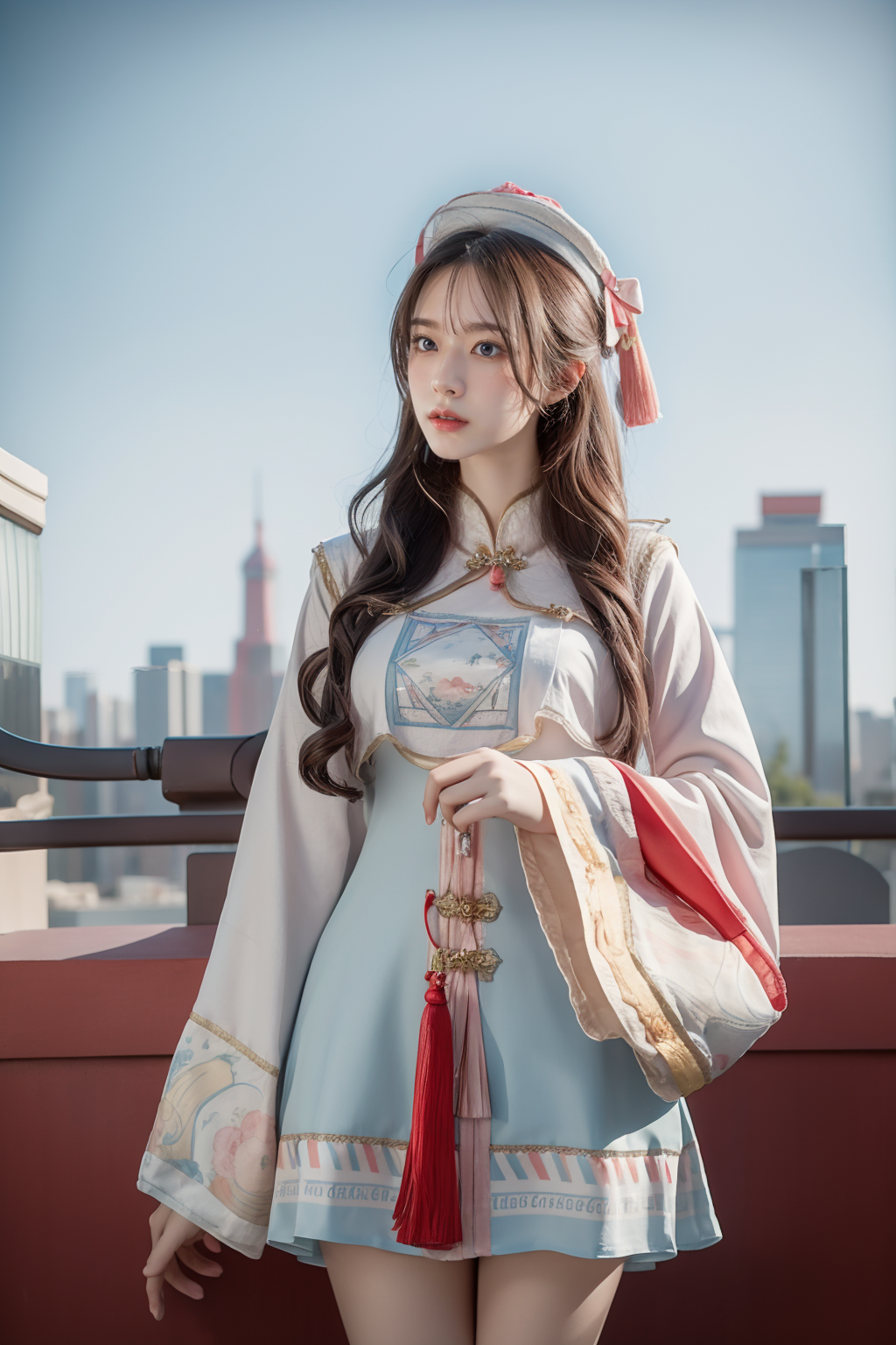 solo,red background,1Girl,standing,,ruanyi0474,dress,bow,chinese clothes,hat,see-through,wide sleeves,tassel,cowboy shot,outdoors,cityscape,<lora:0474 Zombie little loli_v1:1>, best quality,masterpiece,highres,official art,extremely detailed cg unity 8k wallpaper