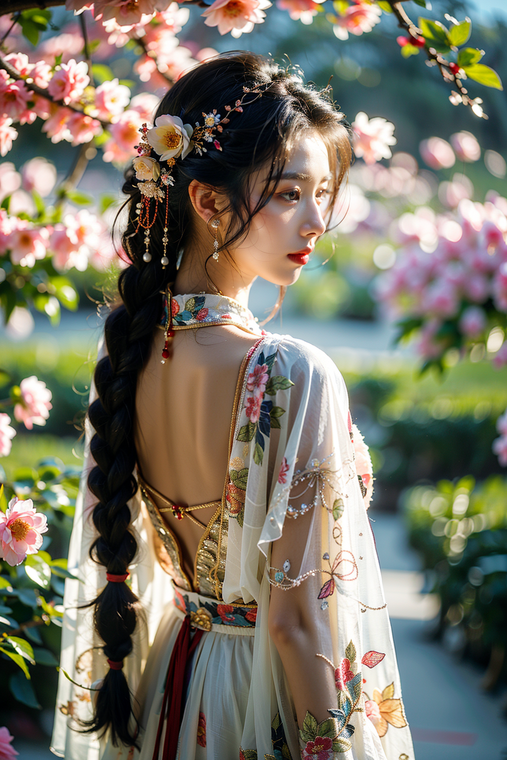 masterpiece, best quality, realistic, 1girl, gufeng style, solo, long hair, black hair, hair ornament, jewelry, standing, braid, flower, outdoors, day, from behind, blurry, tree, depth of field, sunlight, plant, branch<lora:GufengBD-000016:0.7>