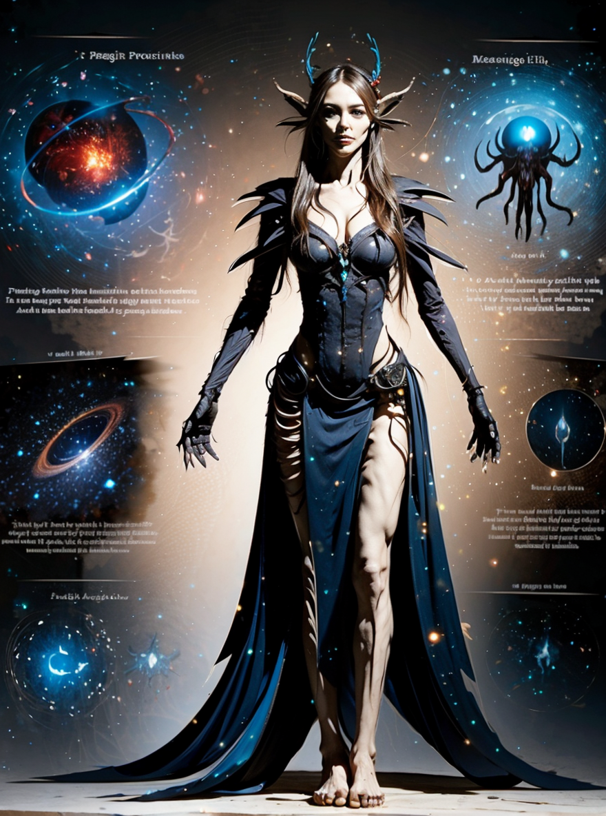 Space-themed <lora:BookSW2:1> Page of Darkness, Magic Elf, Large Breasts, Details, Digital Art, Divided Into Parts, HDR, . Cosmic, celestial, stars, galaxies, nebulas, planets, science fiction, highly detailed