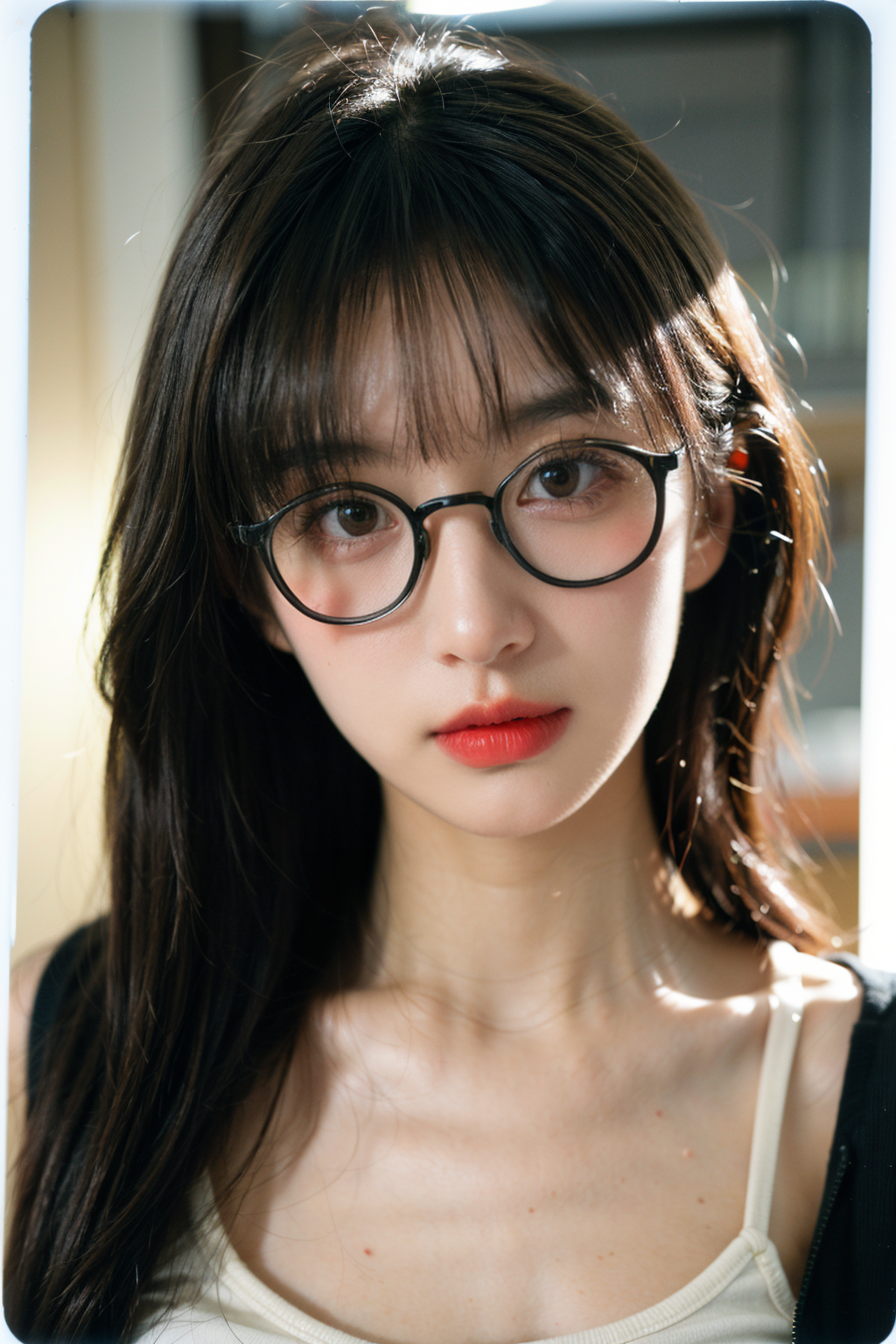 portrait, hard candy, playful face, (green eyes:0.5), ((dark scene, soft lighting:1.3)), long hair with bangs, glossy lips, olive green retro bomber jacket, ((polaroid photo)), thick acetate glasses, big tits, cleavage, tank top, open clothes, epiCPhoto