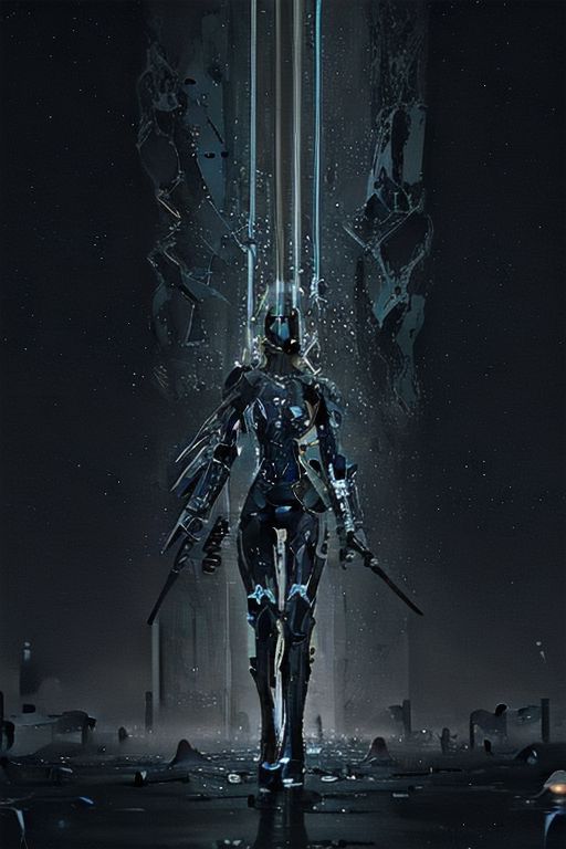sci-fi style a girl in the dark, mecha, sci-fi armor, black matte angular armor, (cinematic pose,action pose ,buringi city, Bladerunner 2049, futuristic, technological, alien worlds, space themes, advanced civilizations