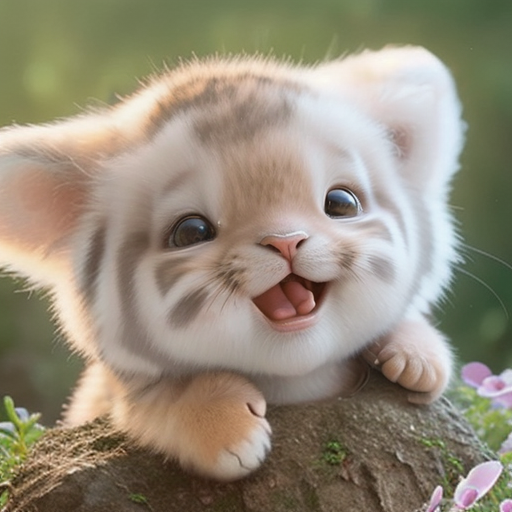 1 cute tiger, happy,open mouth,holding camera, tree_stump, flowers, adorable , fluffy, photorealistic, soft lighting, <lora:rabbitRabbit_v10:1>