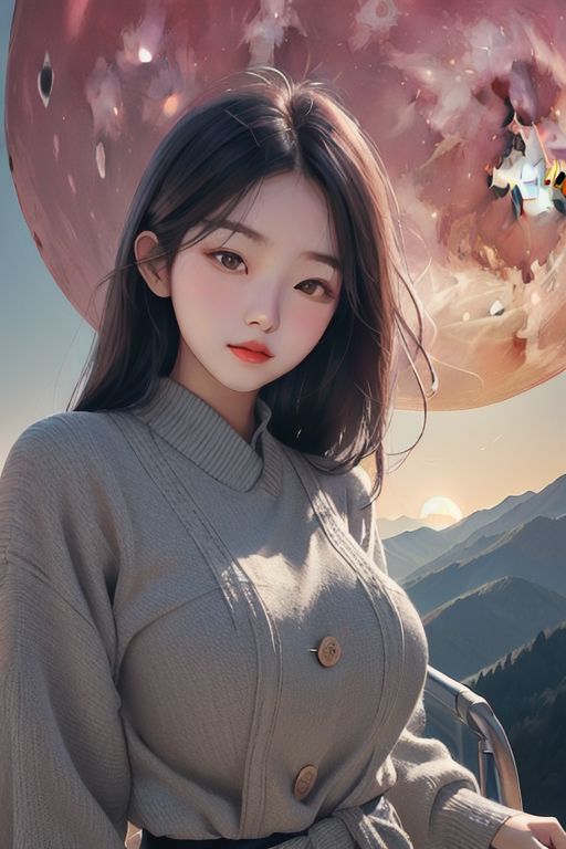 Big-breasted Korean girls with long straight hair and short stature wearing modern clothes are looking down from the top of a mountain as a large red moon sets at the end of the horizon.