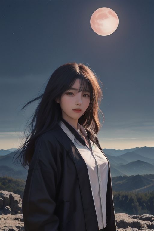 Big-breasted Korean girls with long straight hair and short stature wearing modern clothes are looking down from the top of a mountain as a large red moon sets at the end of the horizon.