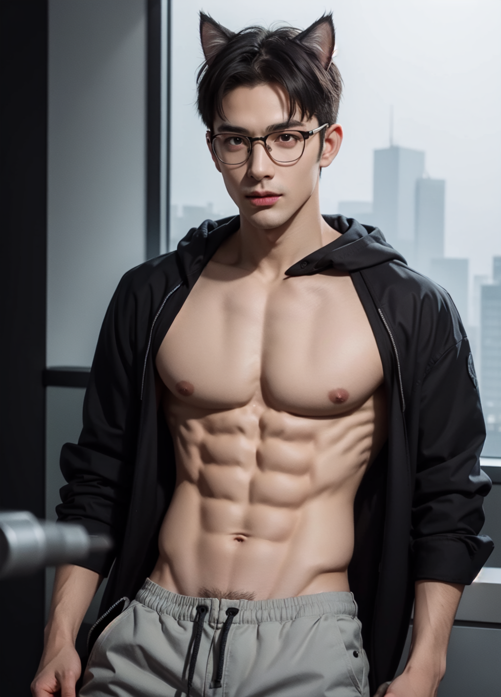 Broca_b,male focus,animal ears,1boy,black hair,solo,muscular,short hair,yellow eyes,hood,tail,abs,cat ears,pectorals,muscular male,cat tail,nipples,clothes lift,pants,shirt lift,cat boy,lifted by self,official alternate costume,toned,toned male,clothes in mouth,mouth hold,shirt in mouth,censored,pubic hair,bar censor,male pubic hair,best quality,masterpiece,highres,realistic,male focus,looking at viewer,black-framed_eyewear,, ((masterpiece)),((best quality:1.2)),High Resolution,8k,(ultra_realistic:1.3),(photorealistic:1.4),sharp focus,close up shot,extra wide-range,detailed background,depth of field,