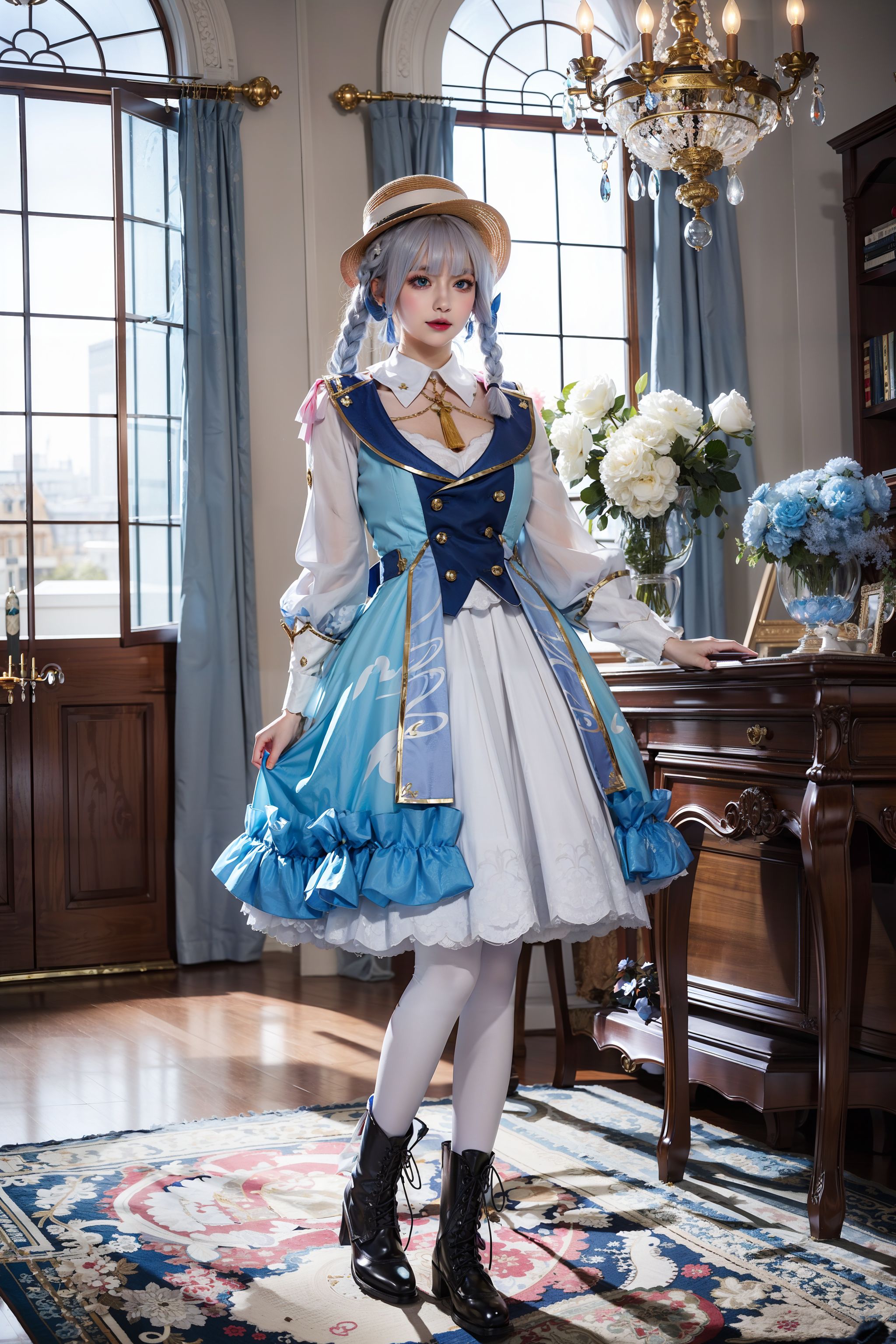 <lora:ayaka:0.75>,kamisato_ayaka,1girl,hat,blue hair, braid, blue eyes, white pantyhose, brown boots,standing, full body, blue dress, indoors, decorations, doors, chandelier, book shelf, window