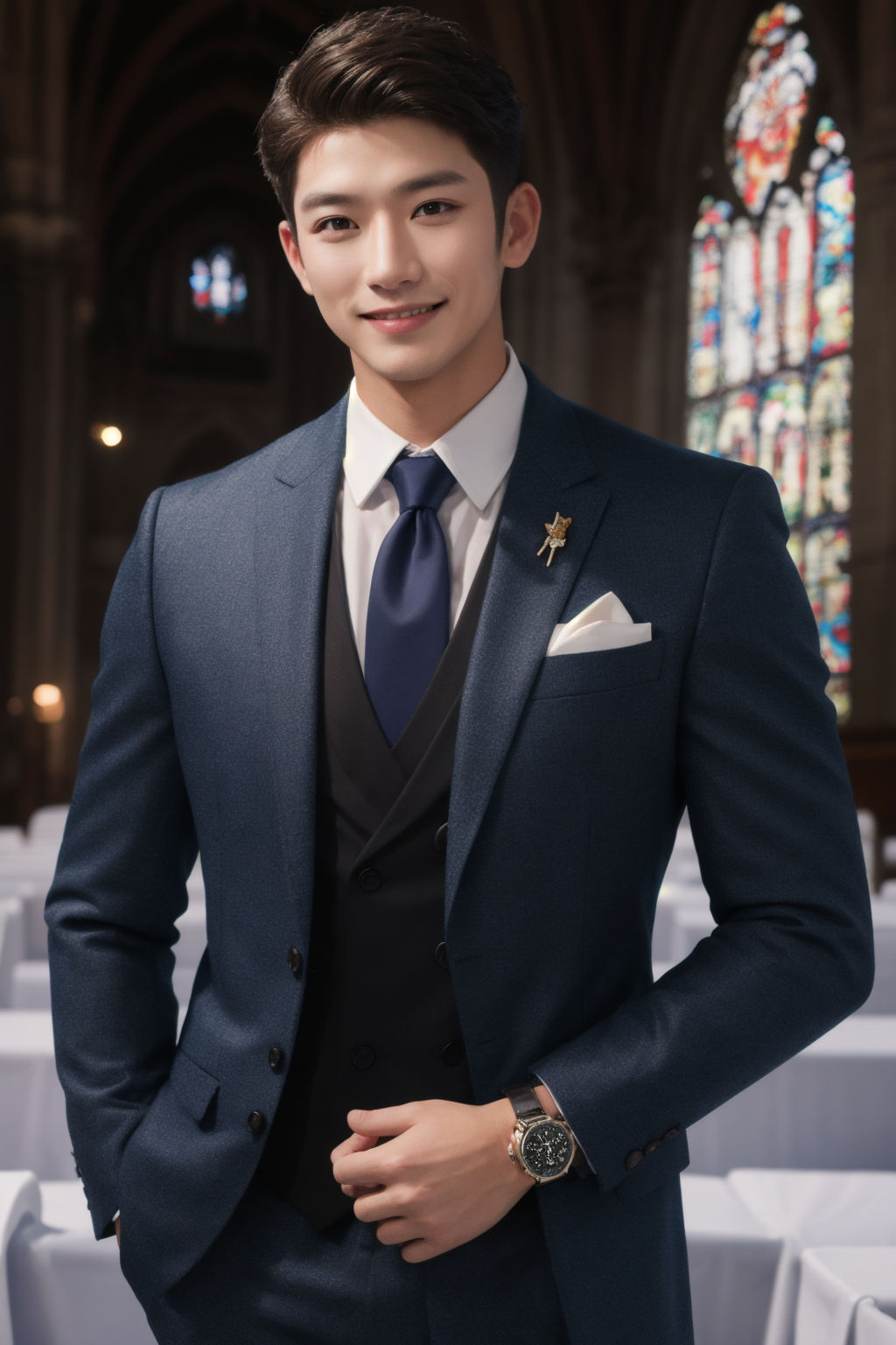 <lora:nwsj_boy_v1.0:0.7:FACE>1man, crew cut, watch, cowboy_shot, smile, Muscular Frame, looking at the viewer, groom's formal wear, church,
