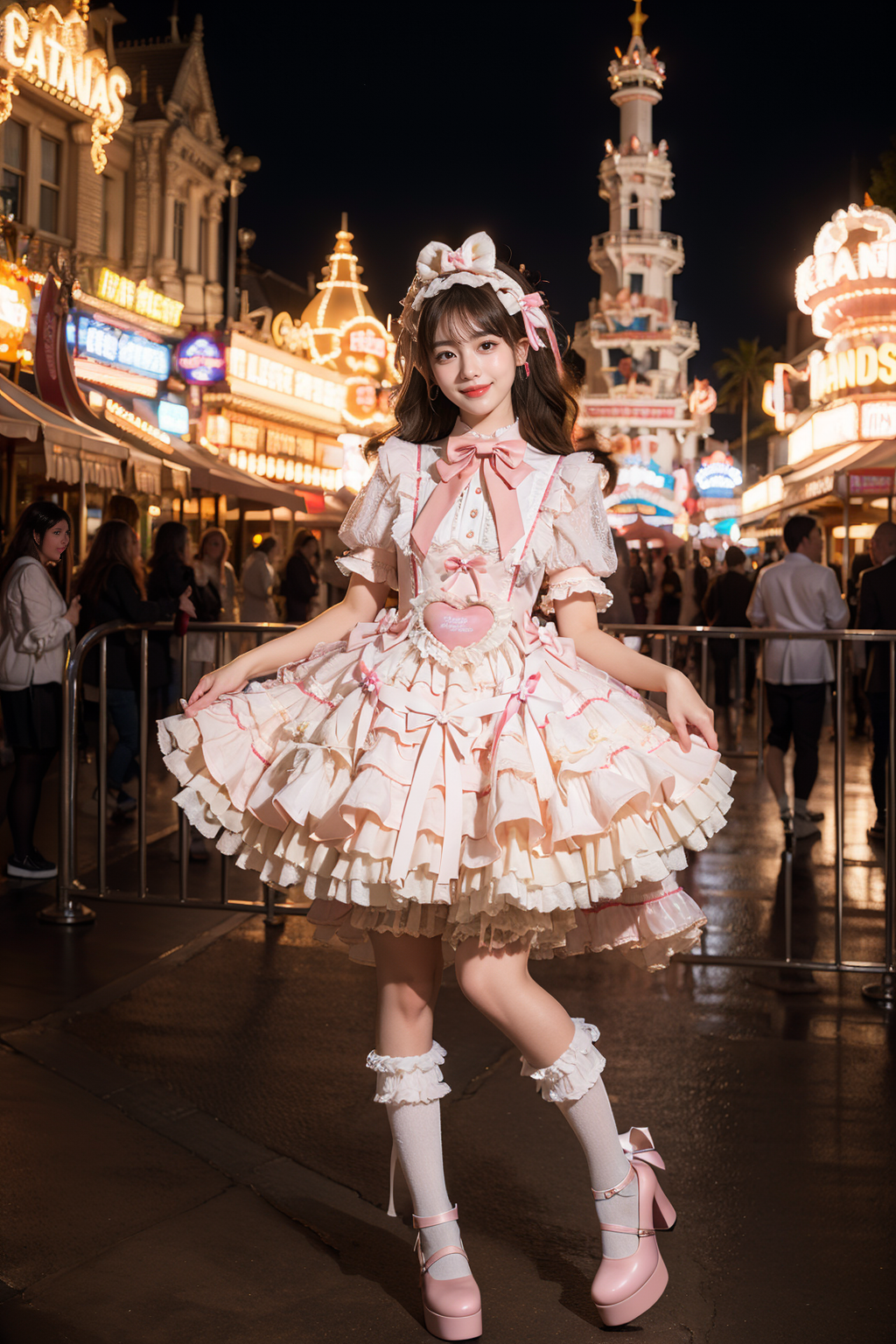 best quality, masterpiece, realistic, photorealistic, 1girl, solo, smile, black hair, long hair, standing, full body, cyb dress, dress, pink dress, layered dress, frilled dress, short sleeves, bloomers, white bloomers, ribbon, bowtie, frills, bow, dress bow, heart symbol, hair bow, hair ornament, frilled socks, platform heels, night, light, neon light, amusement park, people, detailed background, <lora:sweet_attire_style5_v1:0.7>, <lora:Background Detail Enhanced_Si_v3.0:1.5>