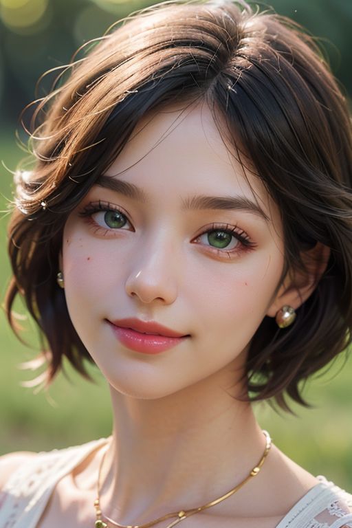Best quality, masterpiece, ultra high res, (photorealistic:1.4), solo, 1girl, young girl, tender smile, tomboy, necklace, looking at viewer, green eyes, make up, glowing skin, pink lipstick, white skin, flower background, off shoulder, (detailed face:1.4)