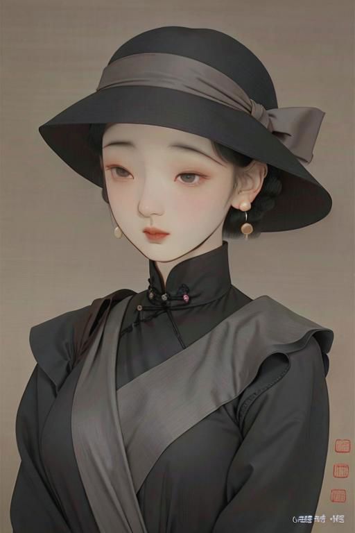 mingyuan,gongbihua,A girl, upper body, black curly hair, short hair, black eyes, thin eyebrows, thin eyes, pearl earrings, high neck brown cheongsam, gray suit, brown top hat, a bow ribbon on the chest, standing, head to the right, body to the right, light brown background