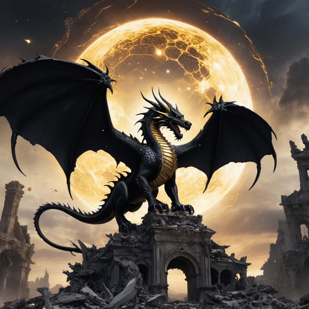 A majestic black and golden dragon circles above the shattered ruins of time in a serene vigil over the corpse of the universe