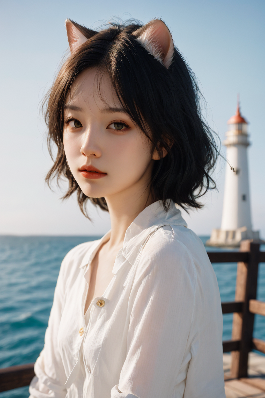 <lora:Yan2:0.7>, Coastal beauty, 1girl in a charming nautical outfit, (fluffy cat ears, short white hair), striped shirt, (bright eyes, sun-kissed skin, carefree expression), sandy beach background, lighthouse, gentle sea breeze, playful pose, dynamic composition, golden hour lighting, blurred background, rich colors, fine details, hyperrealistic, 50mm lens, relaxed atmosphere. portrait photography, 35mm film, natural blurry