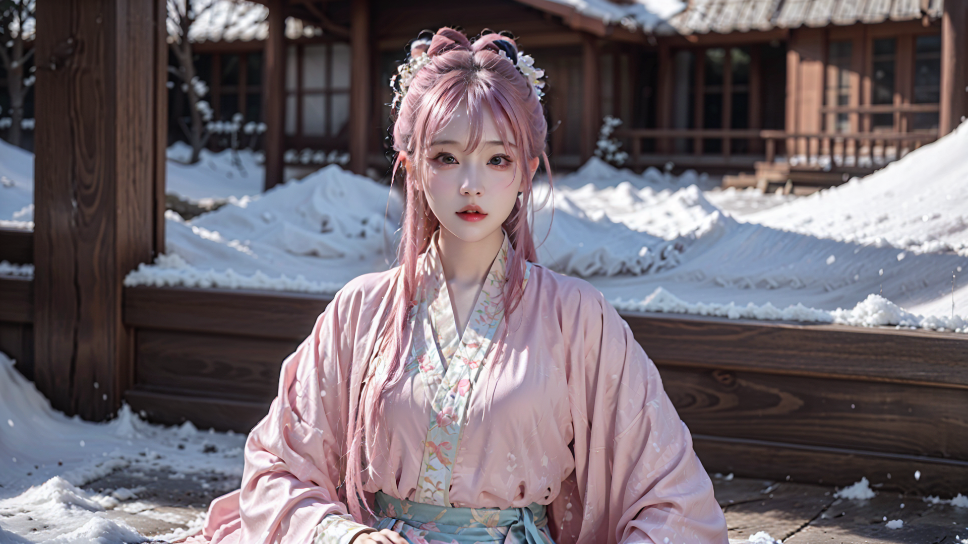 face lighting,bright backlight,medium breasts,super high resolution,best quality,Photos,4k,(Realistic:1.2),1girl,Pink hair,(Snow:1.2),hanfu,sky blue clothes,Half-body phase,<lora:girl_20230530180912:0.7>,<lora:hanfu40-beta-3:0.5>,
